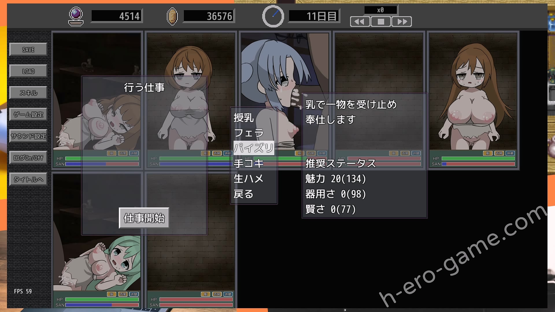 另外奴隸們也有魅力、器用さ、賢さ三種數值,每種play都有最低數值需求。各種play除了增加特定的經驗之外,在奴隸還沒壞掉前也會提升對應的數值。