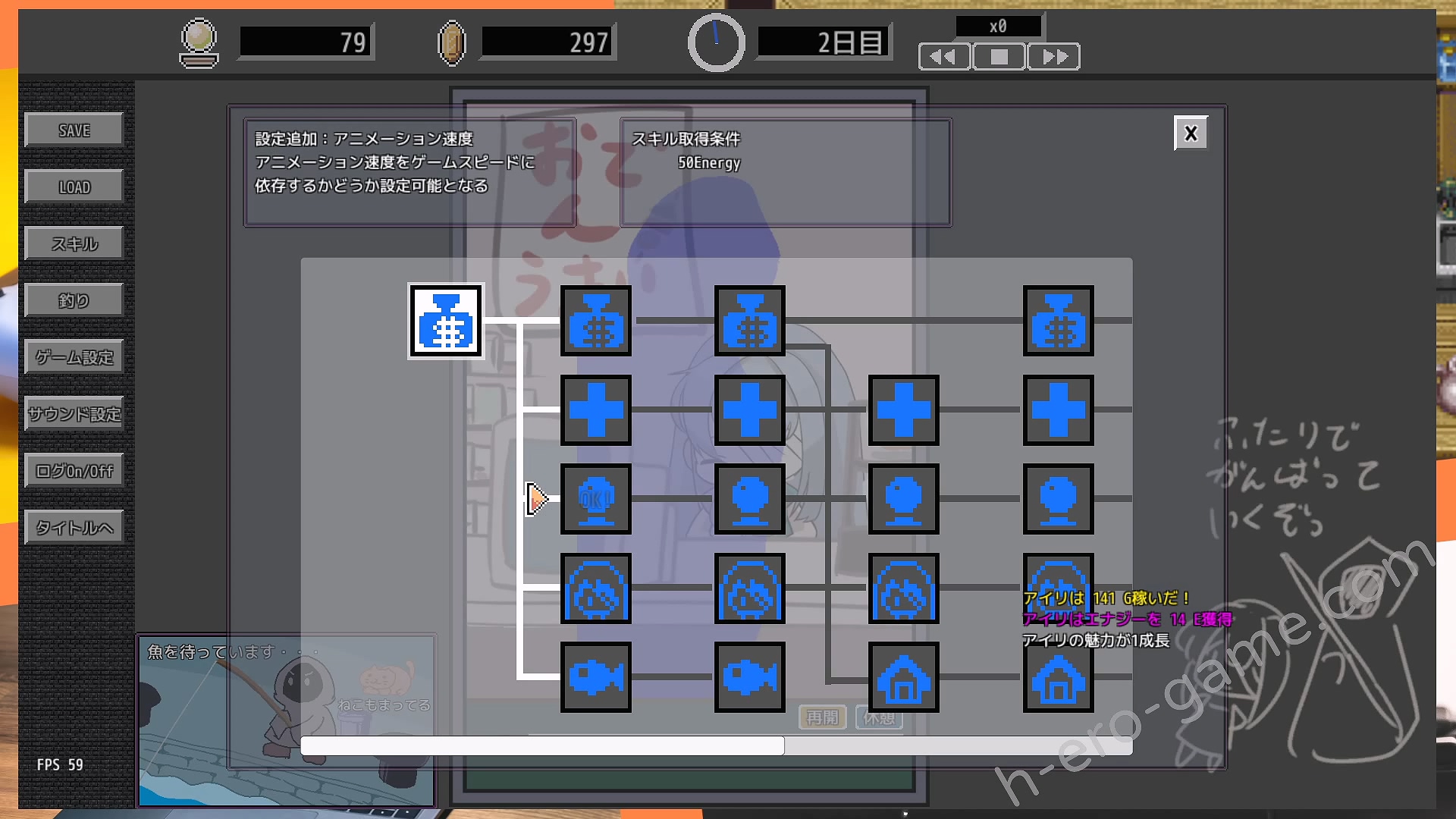 接客可以獲得能源與金錢,兩者都是用來解鎖技能的。技能效果都很明顯,並且在中期就開始有自動休息、自動生產之類的技能,在後期幾乎就是放置遊戲。