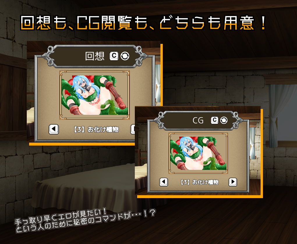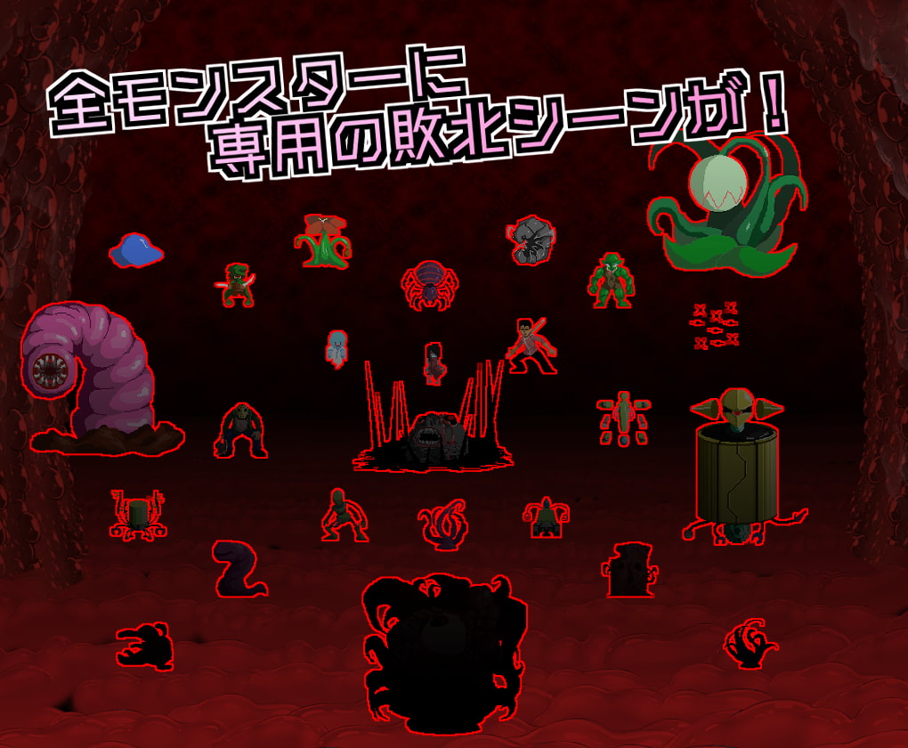 主角HP歸零就進入敗北事件,實際上工口事件也全部都是敗北之後的異種凌辱。因為每種怪物都有對應的場景,所以要收集還蠻費事的(不過有密碼就是了)。