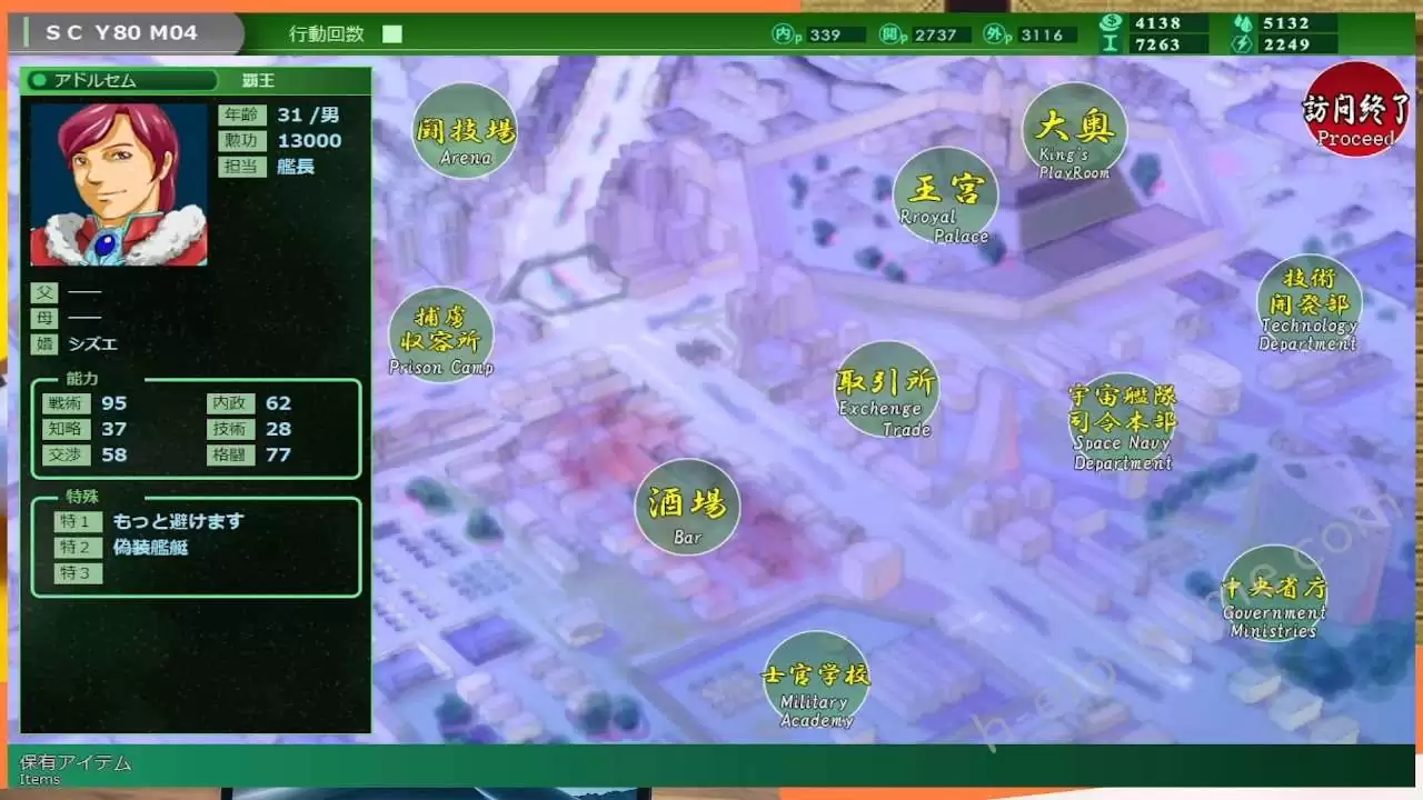 在訪問階段之中有許多區域可以互動,玩家勢力的部下們也會在這些區域中活動,可以與他們互動來增加友好度,提高內政、外交點數或是增加開發進度等等。