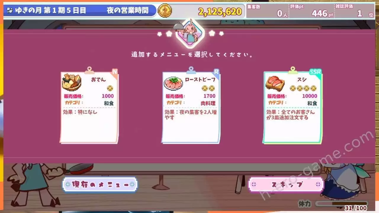 由八種菜品組成菜單,要同時平均擁有四種料理,並且讓菜品的效果互相配合。選擇合理的菜品組合,對營收有直接且巨大的影響。