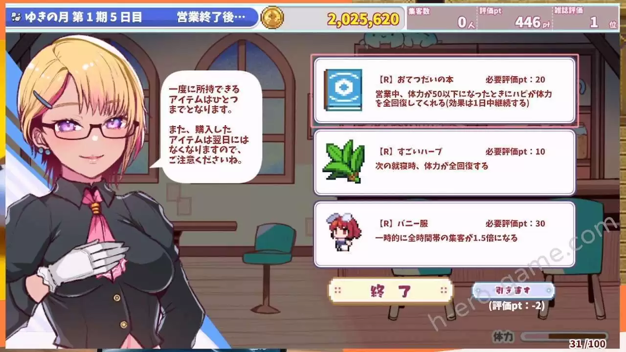 在每天結束營業除了抽菜品之外還可以購買隨機道具,但道具是買了之後就會馬上用掉,並且每天只能買一個道具而已。