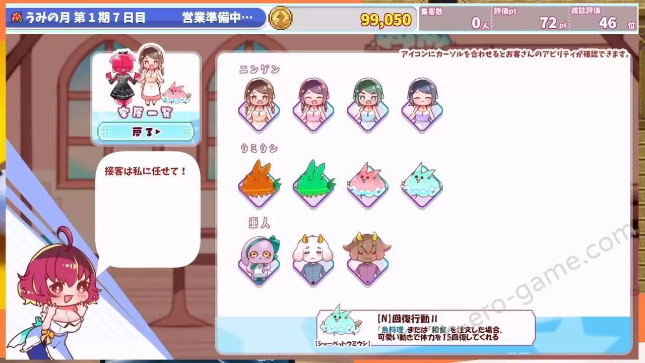 客群分為人類、海牛(ウミウシ)、亞人三類,每種客群都有點餐獎勵。人類點了輕食有機率加點麵包、飲料等副餐,海牛點了魚料理跟和食會恢復七點體力,亞人點了肉料理會加點一份同樣的餐點。
