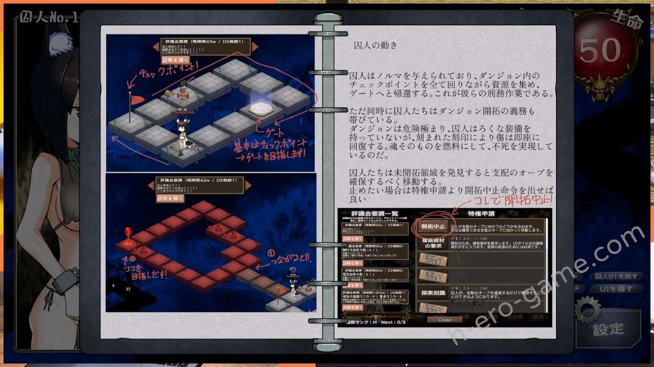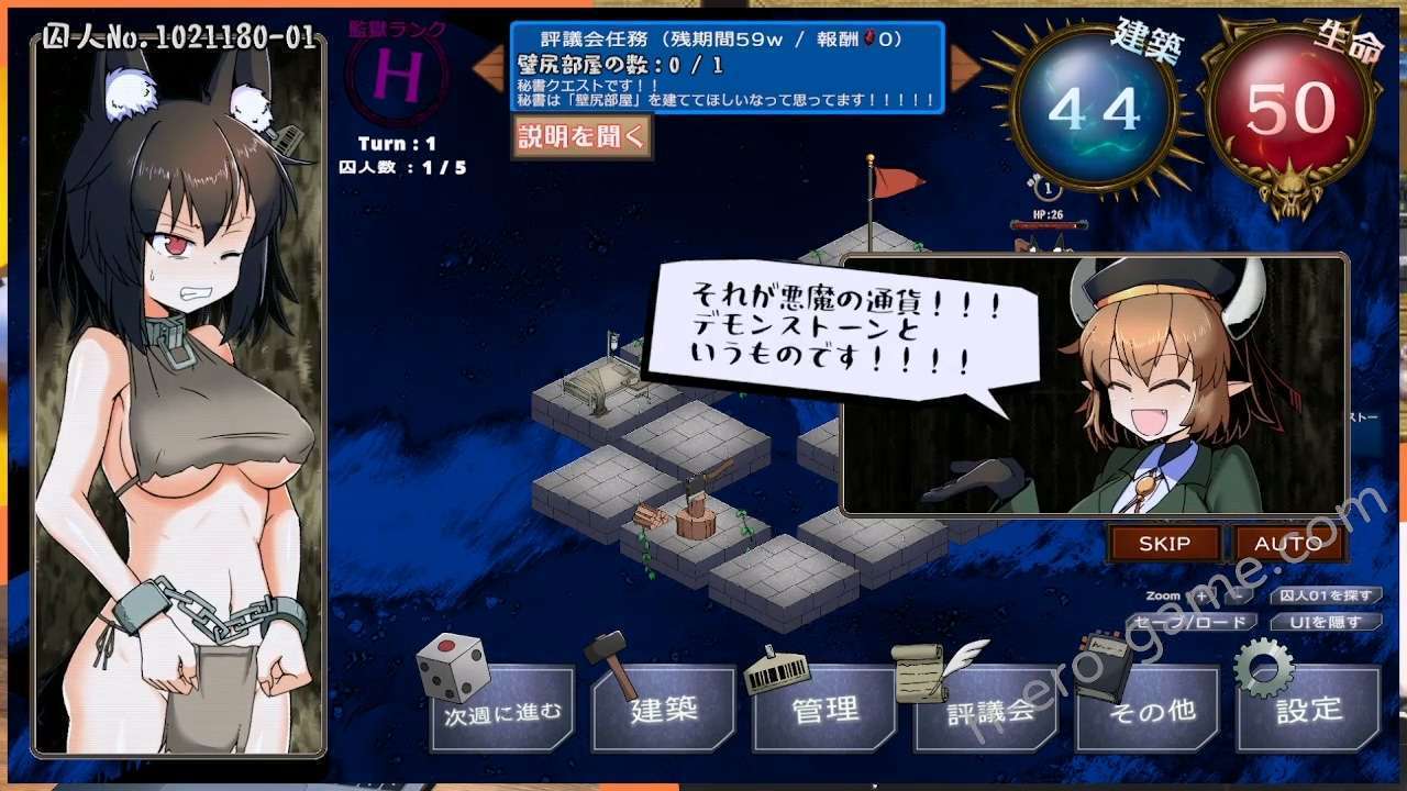大致上就是一面強化囚人一面開拓地城,而重點是要在時限內完成評議會的任務並提升監獄等級。雖然要盡量從囚人身上搾取能源,但也要注意別過度壓榨讓囚人躺在治療房間浪費回合數。