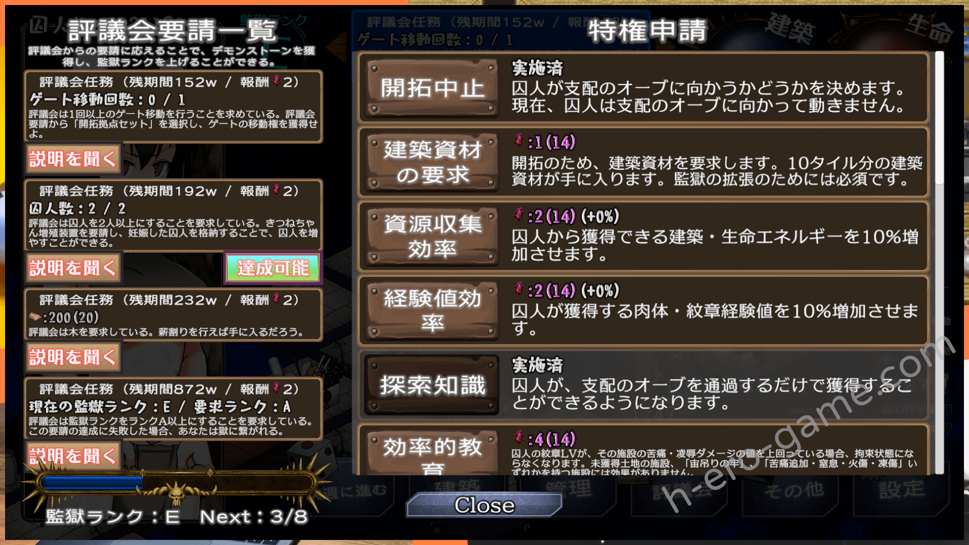 完成評議會的要求會提高評價並獲得惡魔石,評鑑會讓監獄的等級提升,並解鎖更多可以申請的特權。