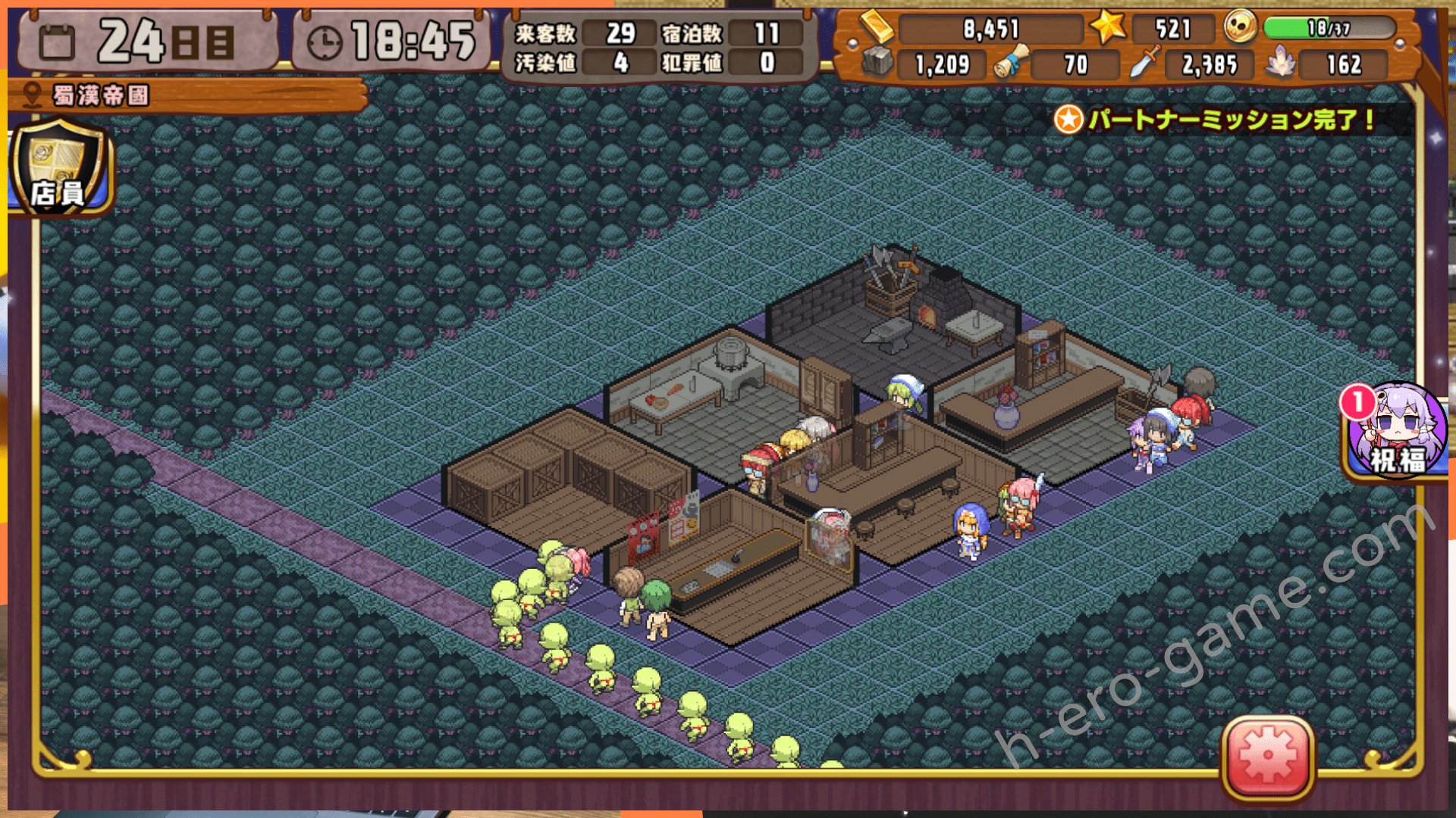 跟修女H之後要把H房間換成鍛造房間跟道具店,以觸發矮人加入的前置事件,這時至少要擴大敷地到六格。因為敷地不夠,如果有人的個人任務是要在H房間中榨精N次的話還得再把H房間蓋回去……