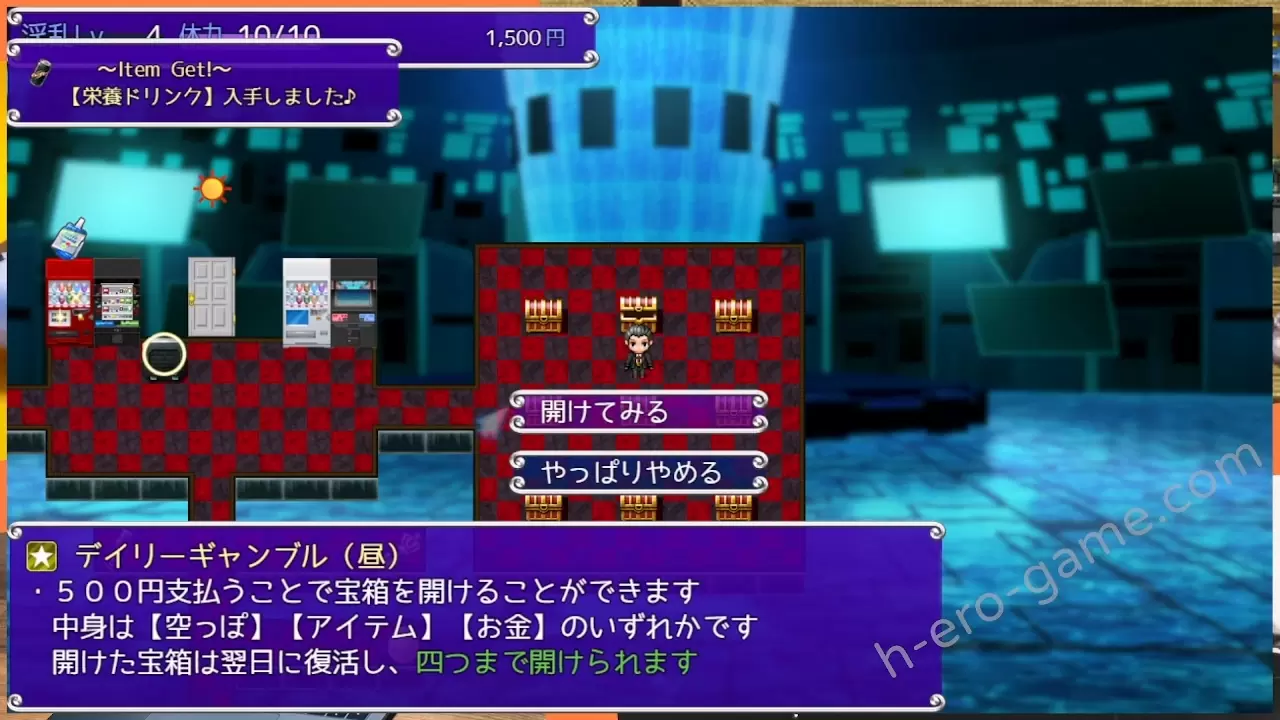 在一天結束時會獲得金錢,這部分是自動結算賣出女主H影片的收入。雖說賣片的錢沒有很多,但賭寶箱的收入很豐厚。有好好安排的話,是可以在一周目中收集到商店中的所有道具。