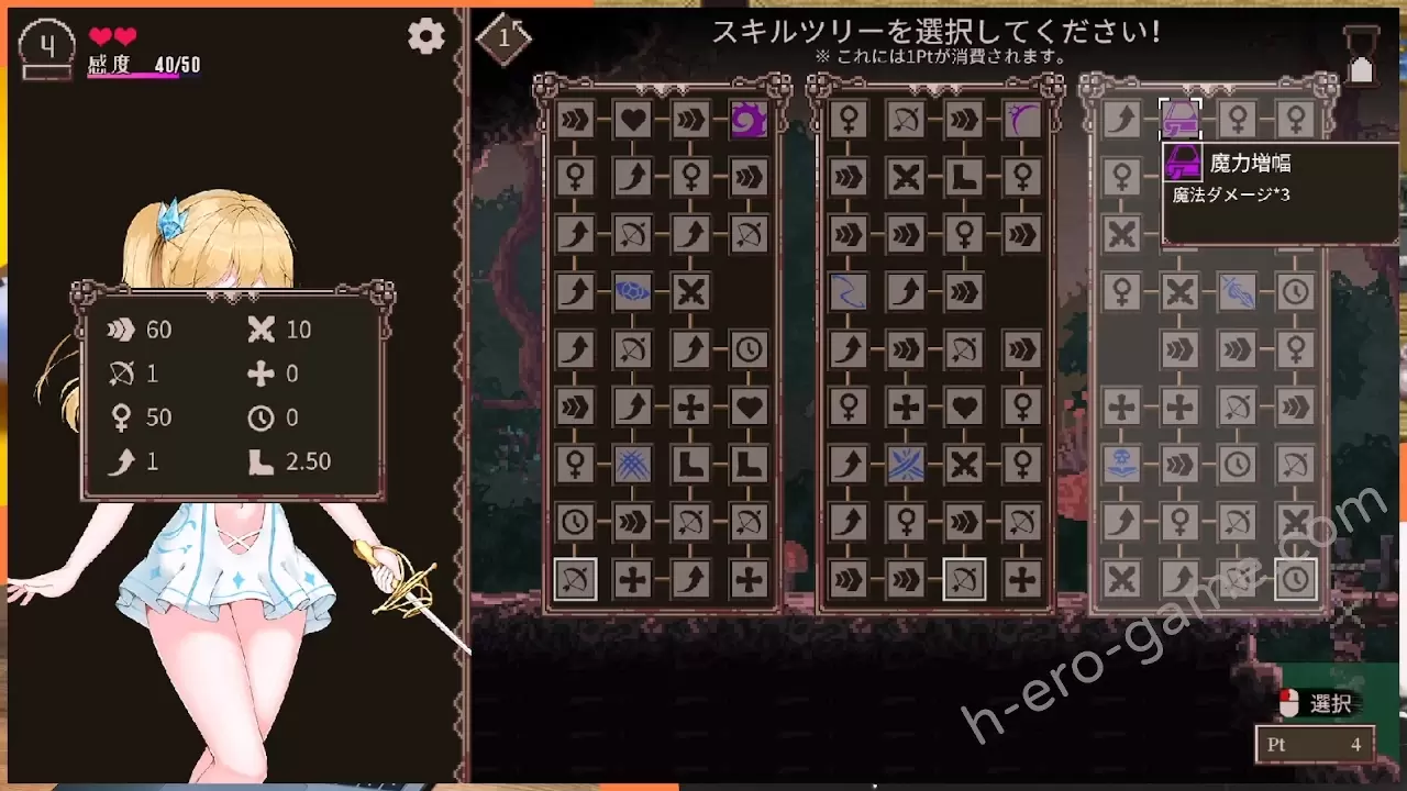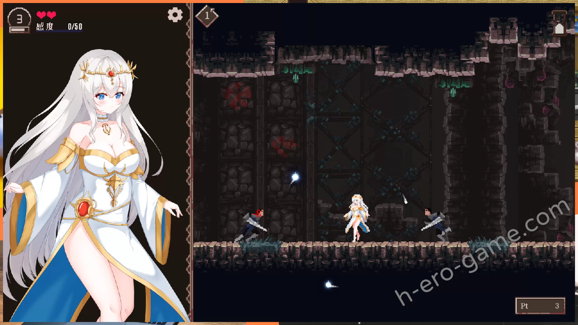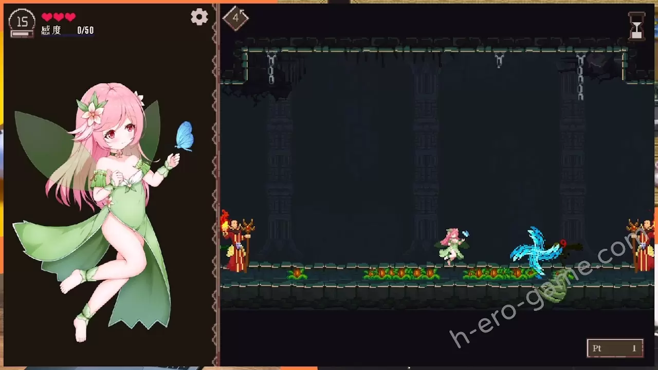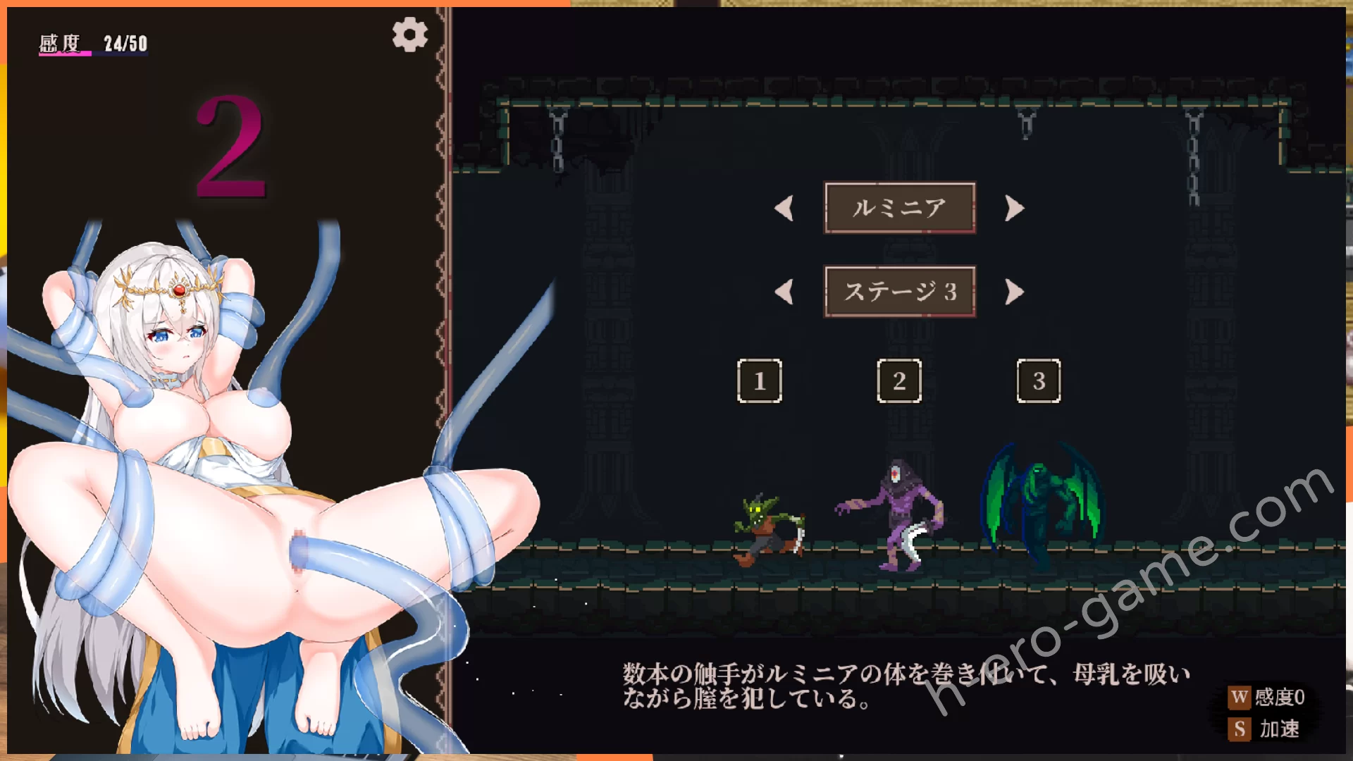 被敵人碰到時會進入H場景並提高感度,感度到最大時絕頂並且體力減一,沒有體力時GameOver。