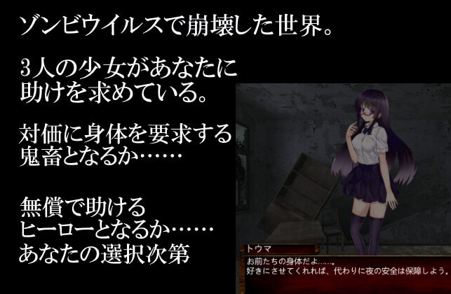 遊戲部分是由ADV與FPS兩部份組成,不過ADV的部份其實只有一點點選項,最主要的是開頭的鬼畜路線與英雄路線。因為女孩子們雖然有從學校中收集到的食物與水,但是三人都沒有自保的能力。男主可以選擇要出自善意保護她們,或是要她們用食物、水與肉體來支付保護的代價。