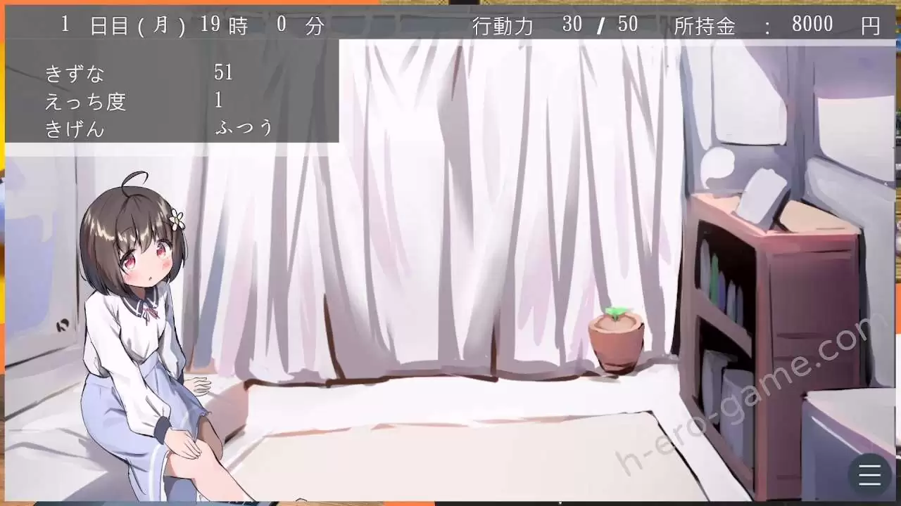 主要就是透過對話、洗澡、一起玩遊戲等行動來提升羈絆(きずな)、H度(えっち度)、心情(きげん)。