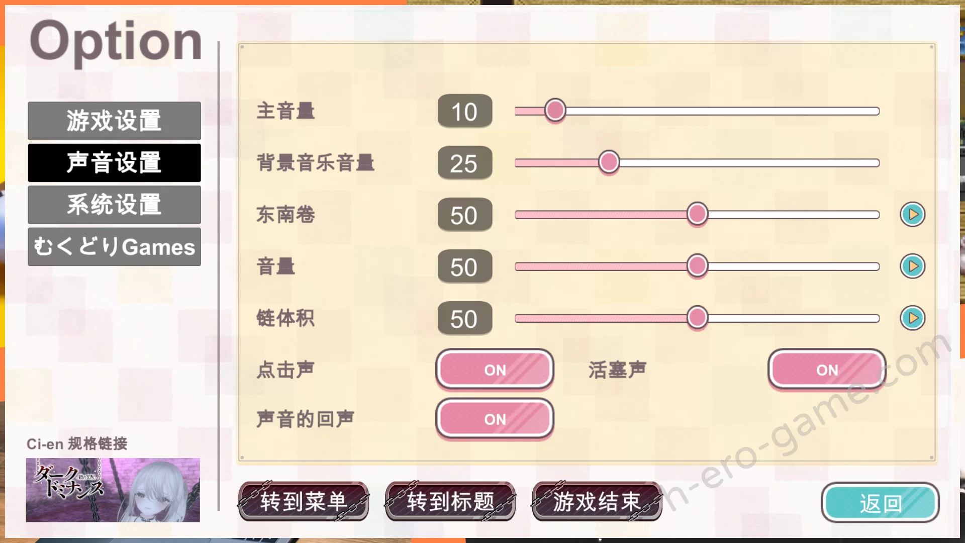 2024年9月1日,由「むくどりGames」製作的「ダークドミナンス-鎖の支配-」於DLsite發售。初版即支援官方中文,不過是未校對的機翻。