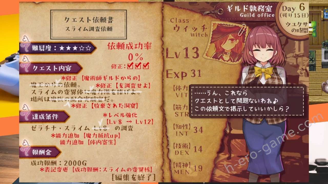 主線任務與支線任務的結果會影響女角的屬性成長,主線任務雖說目的是要讓冒險者失敗,但其實只需要修正某些地方掩蓋掉這是來自魔王的委託就好。例如,將「來自魔王的委託」改成「來自公會的推薦」。