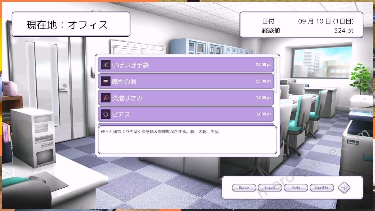 輔助道具方面,第一個買調情手套(いぼいぼ手袋),它可以對胸、尻、大腿生效,都是不用脫衣也可以癡漢的部位。魔性之唇有效的耳、口也不用脫衣,但因為都在頭部的關係,沒有三個部位各自在上下兩端的調情手套好用。
