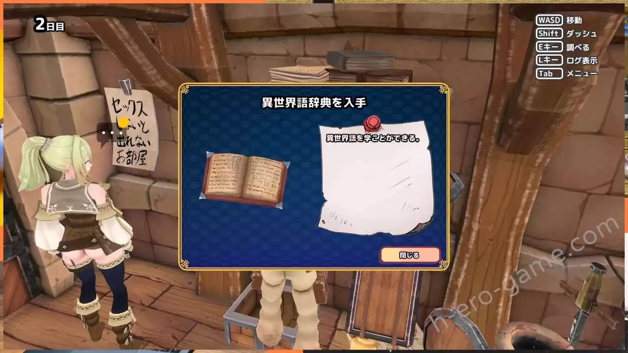 例如在妖精的故事中,第二天在寶箱中可以找到「異世界語図鑑」,將圖鑑交給妖精的隔天再對話,妖精就會知道這個房間要H之後才能離開。