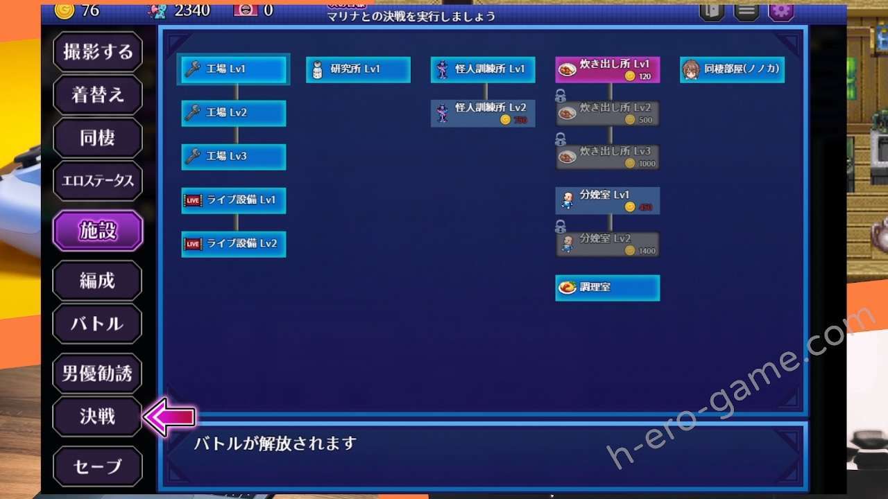 最後就是在達到特定條件後可以發起決戰,也就是打倒目前目標的英雄,成功的話除了推進劇情還能抓到新的女優。不過在決鬥之前需要完成一些條件,像是蓋好某種設施,攻下某個據點之類的。