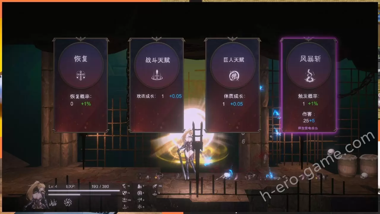 角色養成方面,採用了隨機化的升級系統。每次升級時,可以從四種隨機出現的強化選項中進行選擇。像是提升攻擊力、防禦力等能力,還有增加攻擊時出現額外特效的機率等。