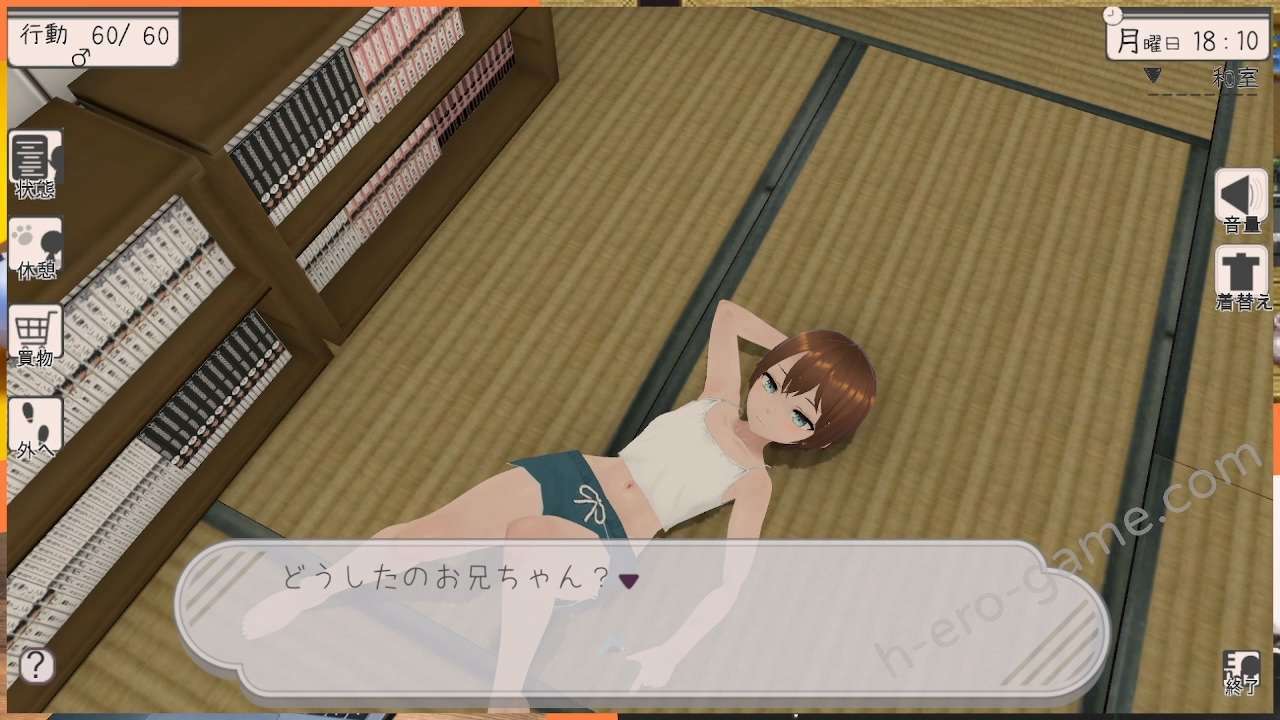 最後,哥哥也有H值,顯示在行動值下的♂符號旁。在打工、打掃、休息等單人的行動後增加,累積到滿之後會在客廳中出現事件符號,點擊了就會發生哥哥壓抑不住性慾的事件。