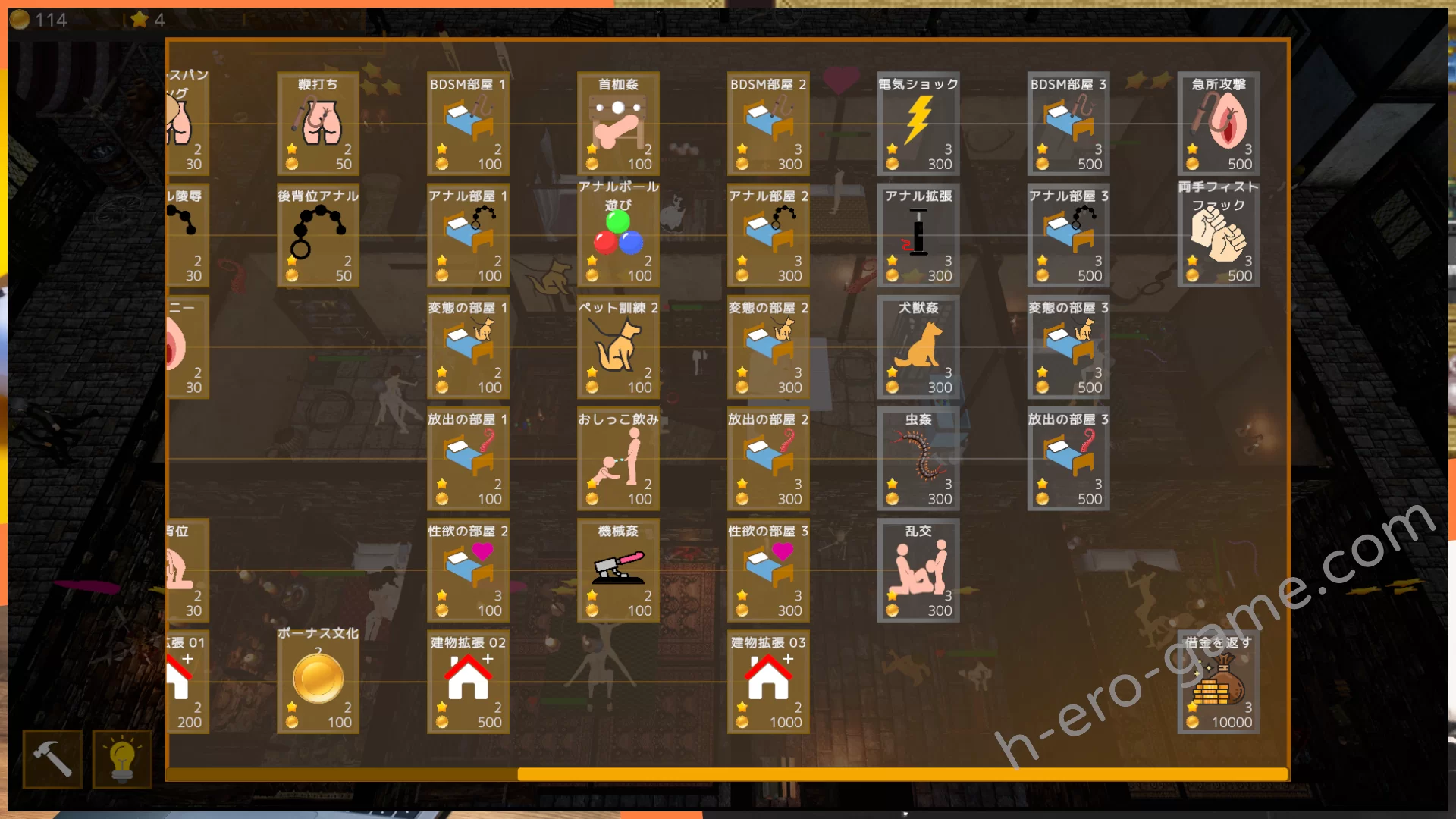 遊戲還有著升級系統,一開始就可以蓋的簡單壁尻房,只能滿足一星的色慾。升級後可以蓋能滿足各種需求的綜合房間,到最後是能滿足多星慾望的專屬房間。