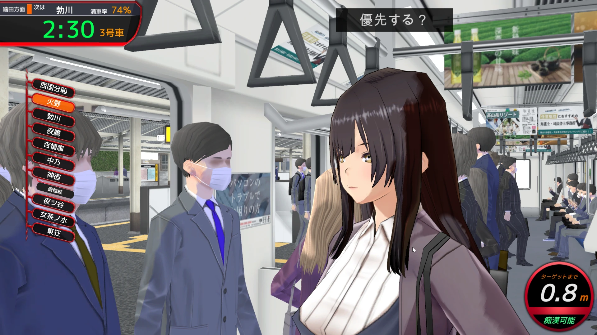 此次系統新增了「標記」功能,在滑鼠移動到目標身上時會有標示並顯示距離,方便在雜亂的車內環境中找到目標。顯示距離相當方便,因為玩家一般會在對應的車廂上等女角上車,但不知道女角會從哪個入口上車,而距離可以大致掌握女角上車的入口。並且設定為優先後,就不會因為其他目標也進入距離而改向其他目標下手。