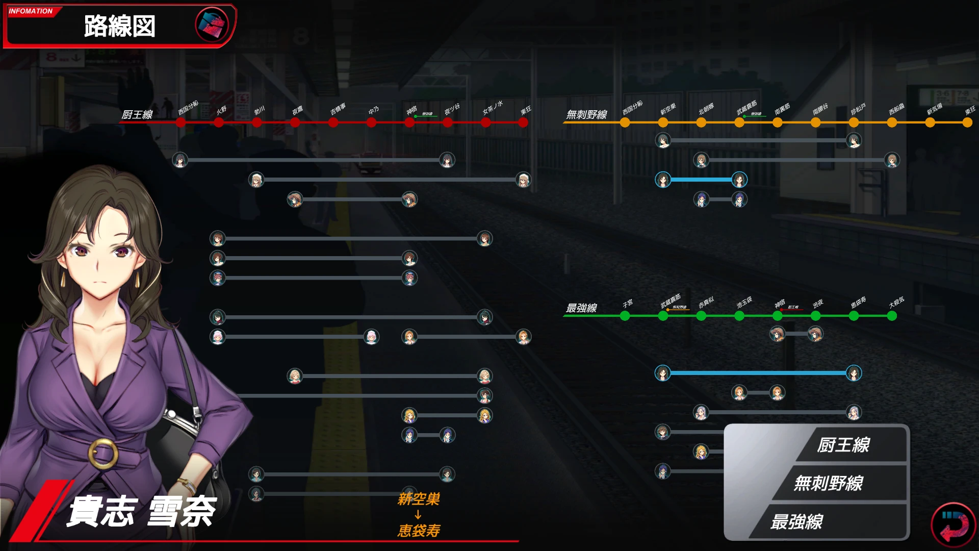再來就是電車不再只有廚王線一條了,而是有三條線,並且可以在特定的車站換乘。女角們也會在各線路間移動,像是貴志雪奈早上會在無刺差線的新空巣站上車,搭到武蔵裏筋換到最強線,最後在惠袋寿站下車。