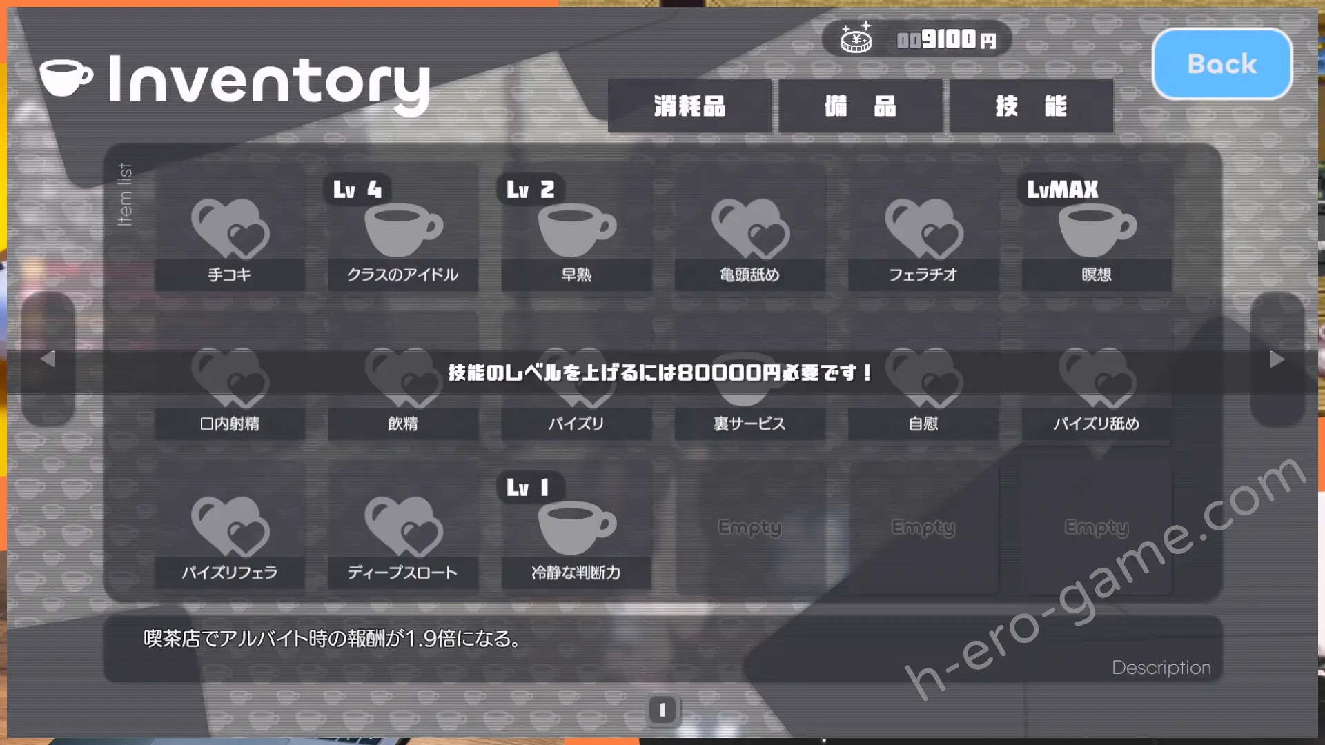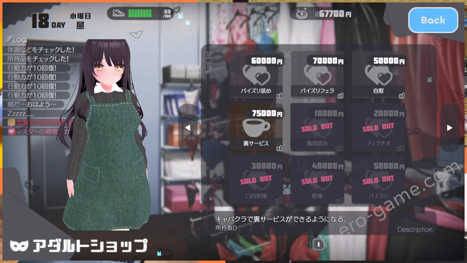 打工除了賺錢之外,還能提升H經驗跟魅力。H經驗值是用來提高H等級,而升級之後會解鎖服飾店中的衣裝,以及成人商店中的姿勢。