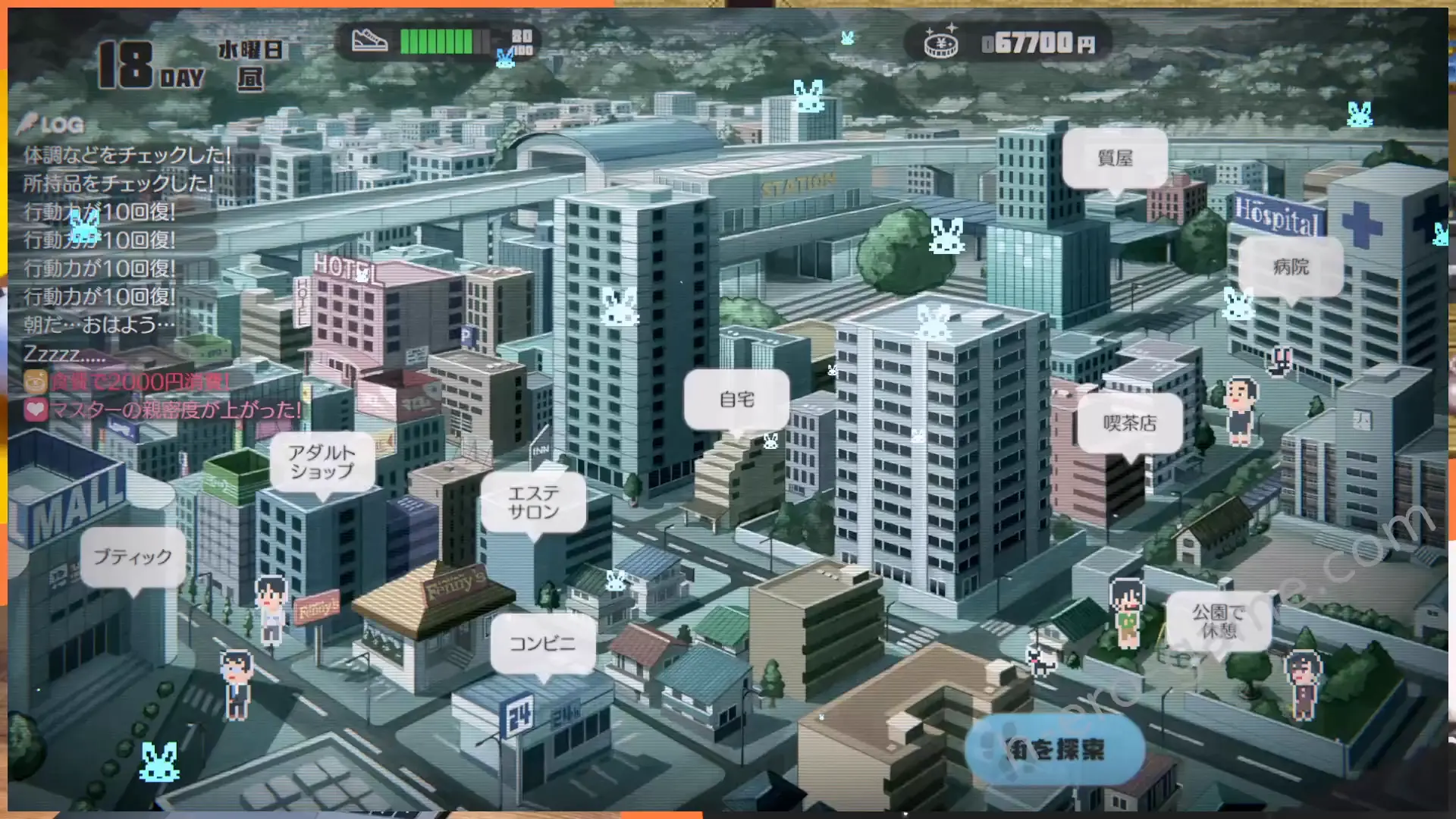 遊戲中的一天分為朝、昼、夕方、夜、深夜五個時段,進行打工或休息就會到下一個時段。
