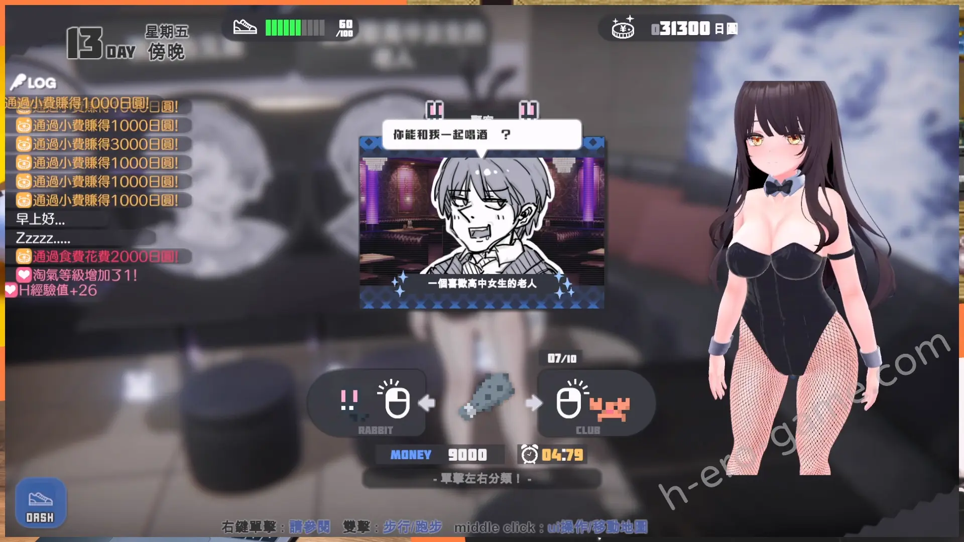 這些打工都要進行小遊戲,像是猜拳、跑條QTE、拉霸等。其中酒店比較特別一點,是跳出各種圖樣,並用滑鼠左右鍵將圖樣分類到兔子或螃蟹。兔子很好理解,就是各種兔子跟蘿蔔。而螃蟹就比較無法理解,是螃蟹、狼牙棒、黑桃卡片。