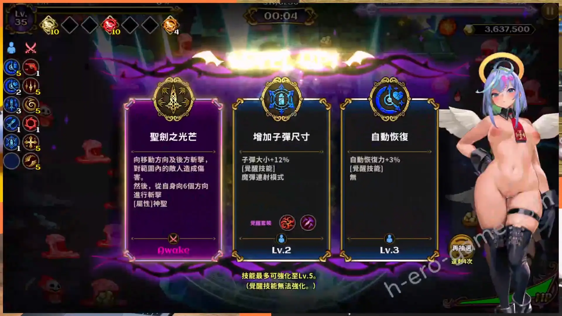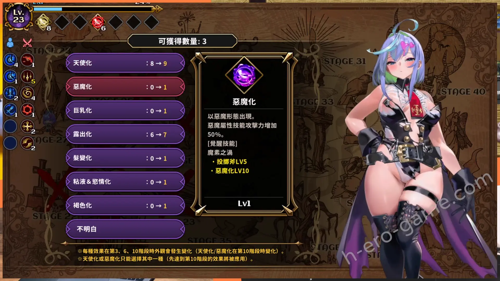 在通過關卡時可以獲得體型變化的點數,可以用在七種體型變化上。女主的身體會隨著點數增加逐步改變,這些變化不僅影響外觀,也會提供各種能力加成,例如露出化提升攻擊力與拾取範圍、天使化增強聖屬性技能等。