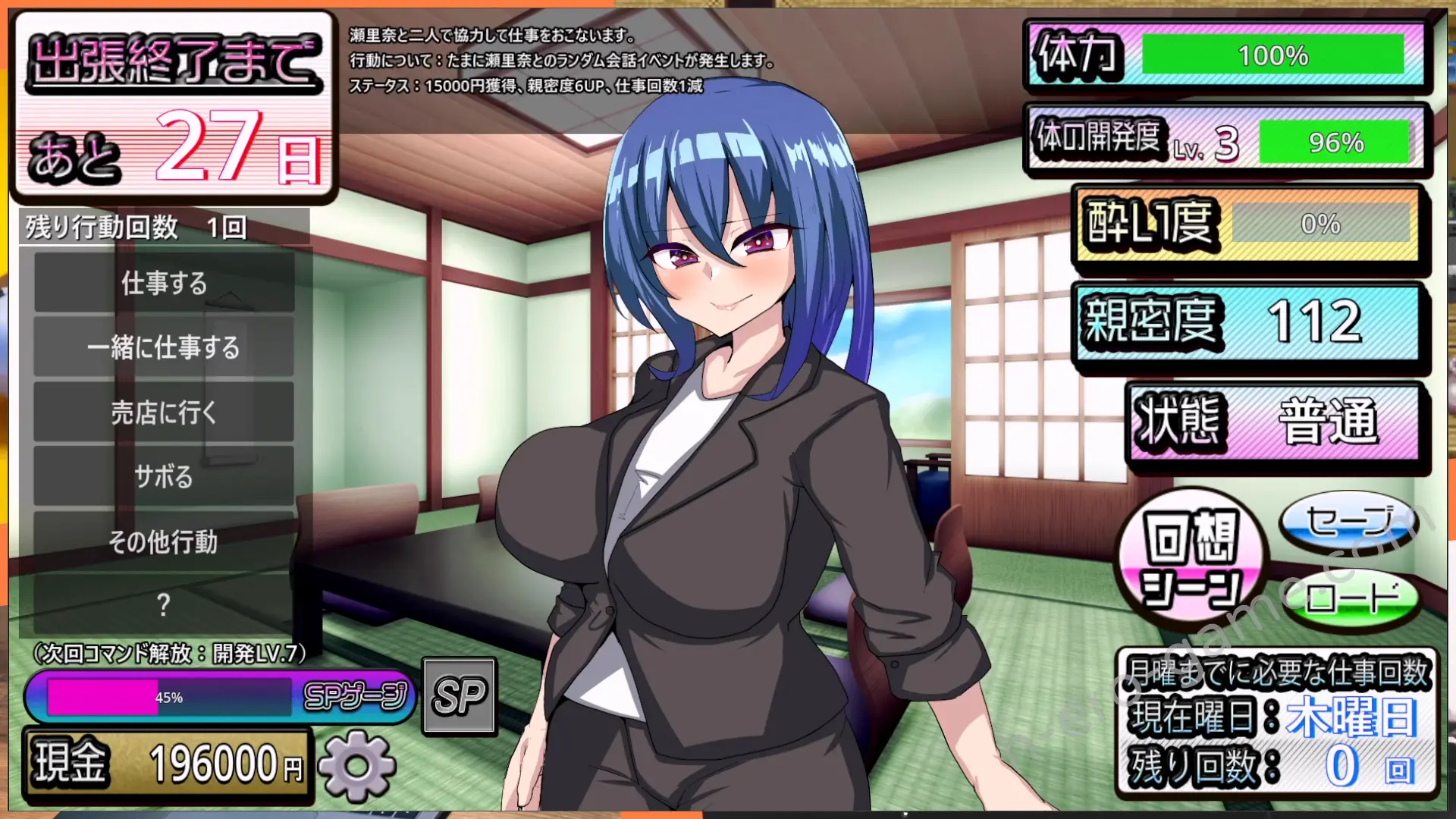 如果把女主灌醉就可以進行更進一步的騷擾,而女主體力耗盡之後會去睡覺,而睡在同一間的上司可以進行夜襲。如果女主是在酒醉狀態中睡覺的話,那就會睡得更深。