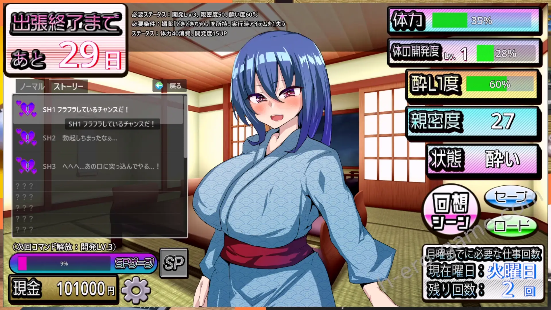 女主有許多的數值,體力主要是會在夜間消耗,像是對話、喝酒、騷擾、觸碰都會消耗體力。酒醉度是在夜間勸酒時累積,主要是影響睡覺時是不是熟睡,還有能不能觸發H事件。