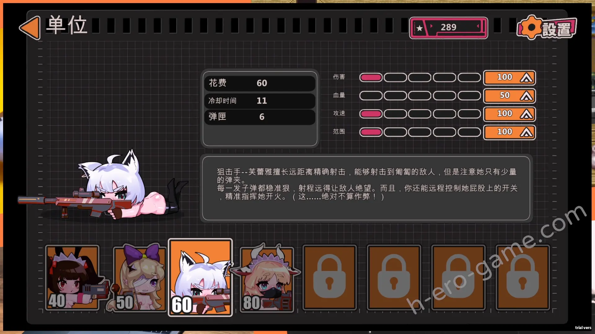 到2-1之後就改用火力手,雖然面板上的冷卻時間數字很大,不過實際上跟槍手差不多。基本上一線放一隻火力手就能處理匍匐者之外的所有敵人了,而且火力手的加特林不用點擊裝彈相當方便。