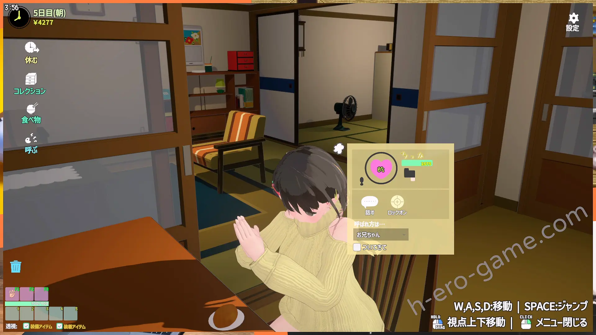 透過滑鼠右鍵點擊少女來確認她的飽食度(就是胃的圖案),並詢問她想吃什麼來提供餐點,而食物的取得是透過電視購物的宅配功能選購。