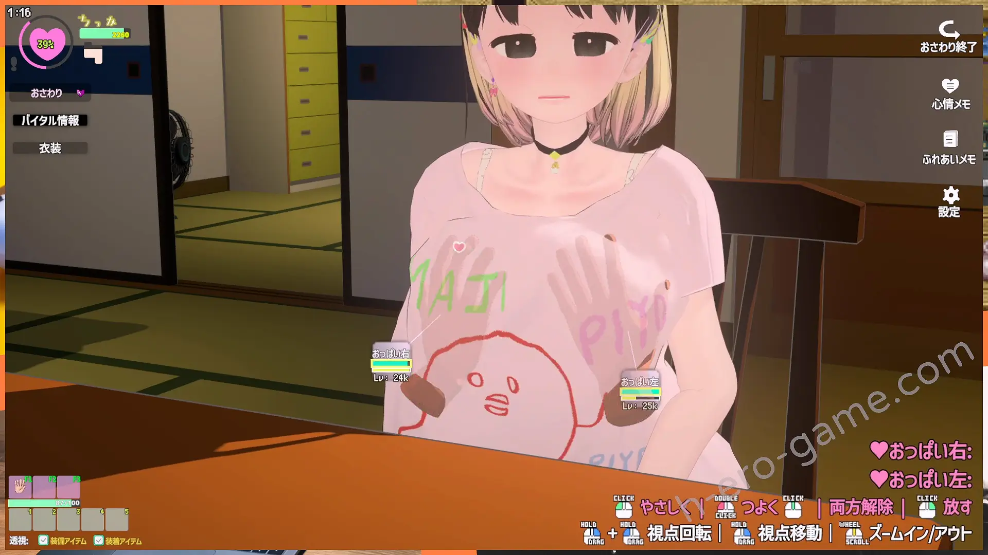 玩家可鎖定特定部位如胸部、下腹、臀部等進行觸摸,並根據互動強度與部位選擇,獲得不同程度的反應、提高部位開發、快感。