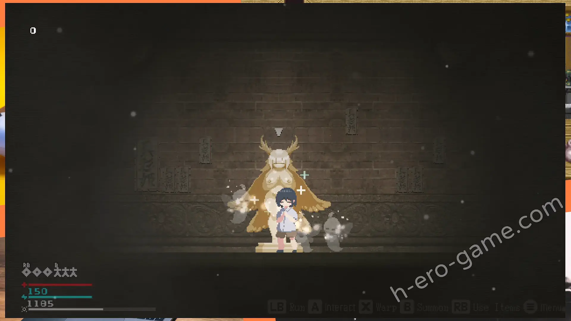 最主要的難度是在進入地圖後找到神像,並在吸光神像之前不被魔物碰到,如果被追上的話會被H並扣血。所以重點是在確認到有神像後,尋找最近的出入口,之後由該出入口進地圖直奔女神像,並在吸完之後逃跑。