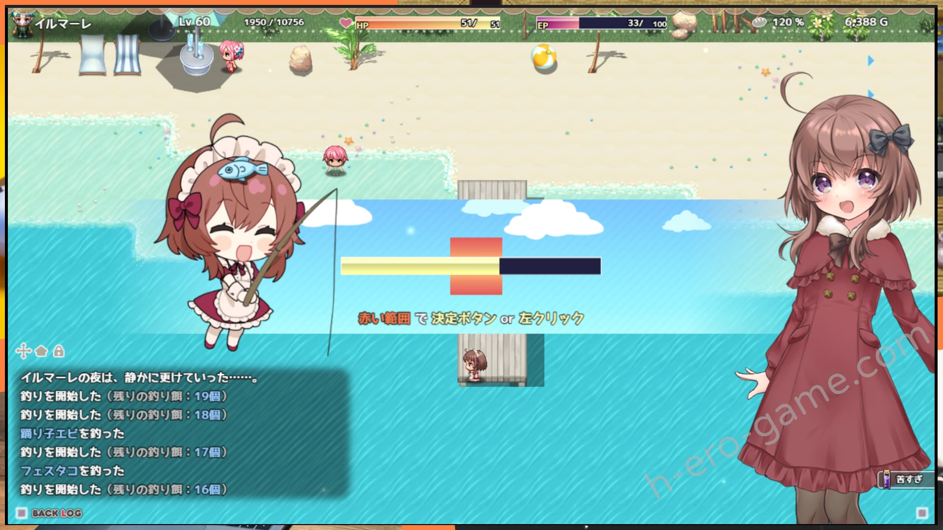 釣魚是最簡單的那種,在特定定點釣魚,魚上鉤後在游標卡入紅色判定範圍後確定就可以釣上。