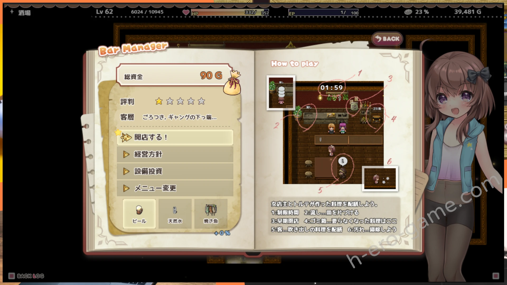 經營酒吧是開店當服務生在時限內盡量送餐給客人並打掃環境收拾碗盤等等的跑腿性質的小遊戲,開店結束後的收入跟名聲可以在酒吧的經營選單裡面逐步升級酒吧的規模與設備,另外酒吧的金錢收入是專屬於酒吧的。此外想解鎖酒吧的新菜單除了名聲外也會需要各種不同的素材來解鎖,素材來源主要是迷宮、釣魚、商店購買,這裡就是花主角自己的錢了。