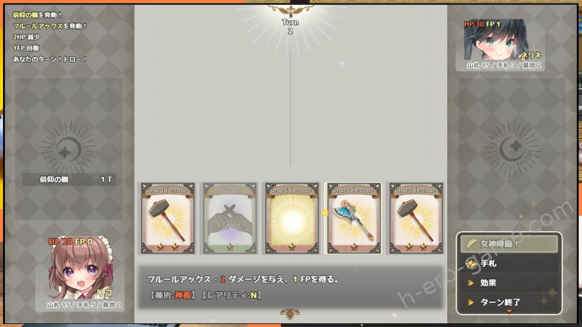 需要注意的是如果FP歸零那女神就會消失回到卡組,需要重新集滿5點FP才能再讓女神降臨,另外普通的打出神器或供品卡牌有時候也會觸發女神的神蹟。遊戲過程中先HP或卡牌歸零的一方為輸家。