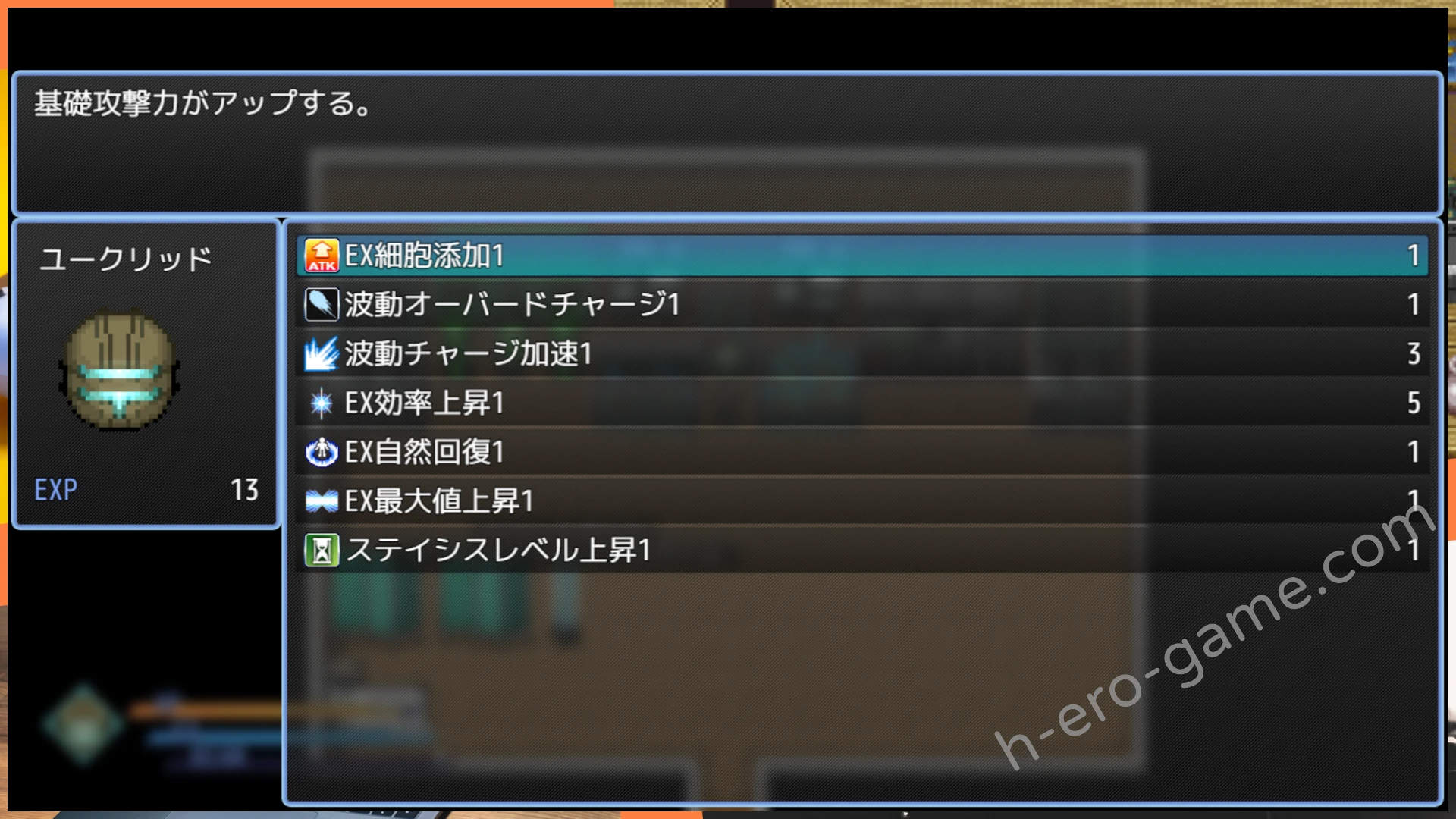 特別說一下,本作有很多以「EX」開頭的詞,例如這裡看到的「EX值」其實就是一般遊戲中的藍條,與「EXP」不是同一種東西。同時「EXP」也不是一般遊戲中的經驗值,而是用來強化武器的「EX細胞點數」。