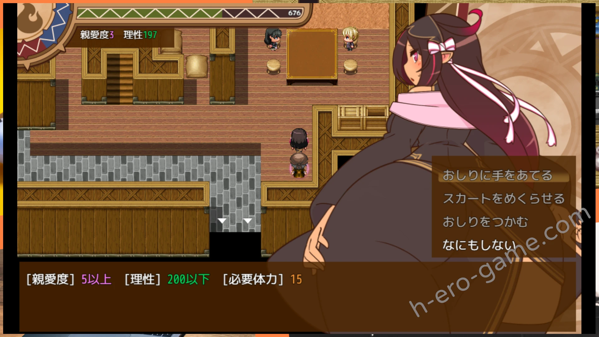 而本作最重要的部分,就是與人妻互動,在序章中人妻有「親愛度」與「理性」這兩項數值,所有的性騷擾都要求特定的親愛度與理性。