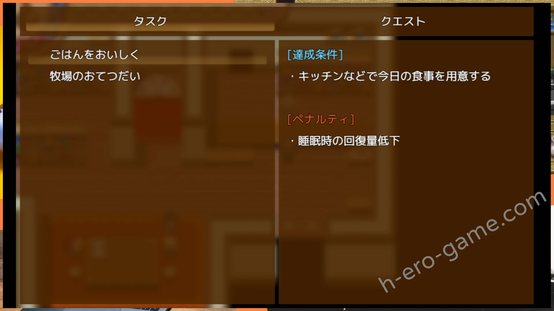 除了委託之外,本作也有重複任務(ダスク)系統,這比較類似是每日或每周要完成的行程。例如每天都要在廚房消耗三個食材做成料理,如果沒有完成這個重複任務的話,當天睡覺時就沒辦法把體力回滿。