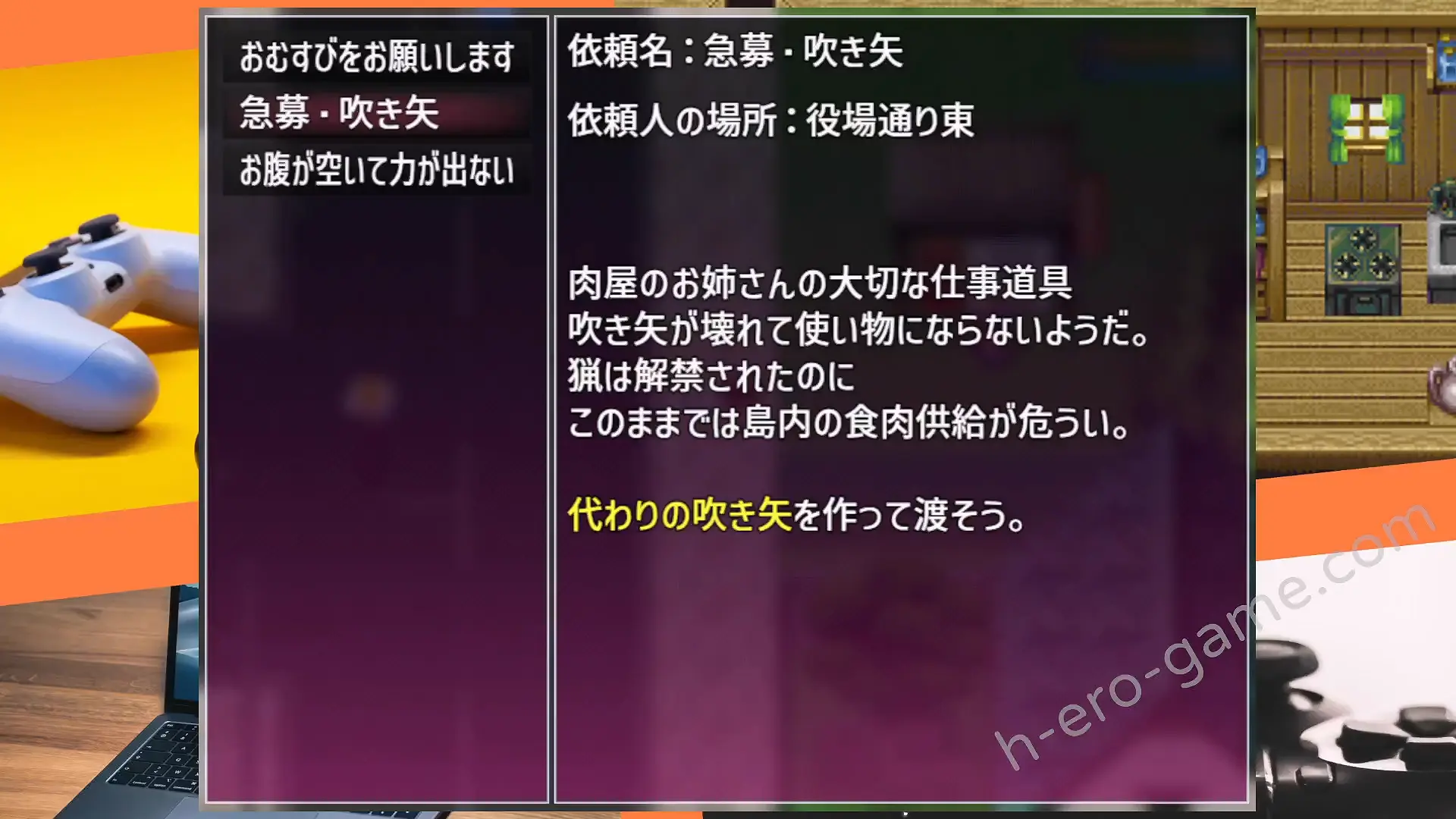 再來在工地邊的無人市場,有個獵人正在抱怨無法打獵,使用自家外面的工作台可以用木材跟纖維做出吹箭,交給獵人之後無人市場就會開始販賣各種肉類。