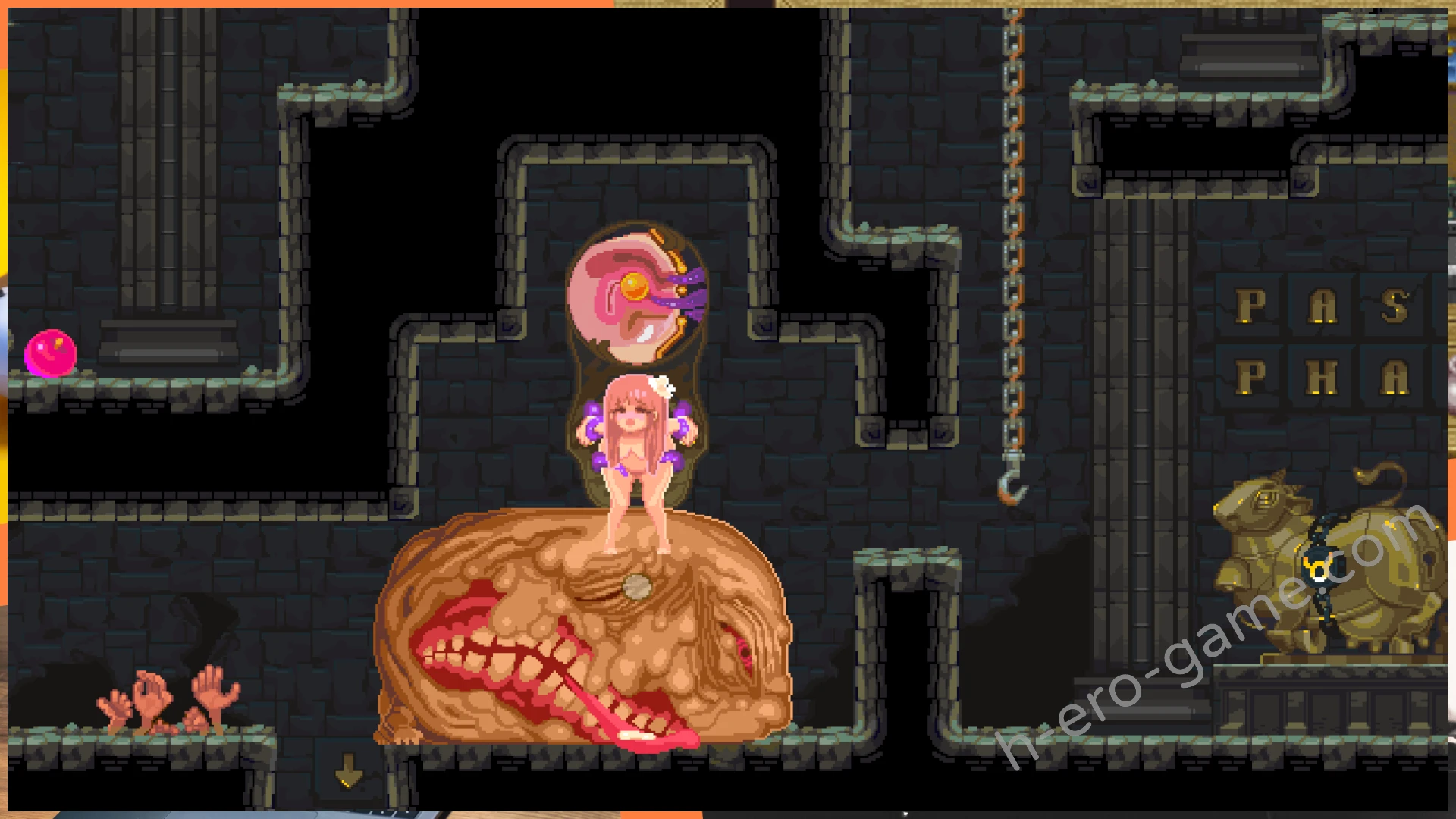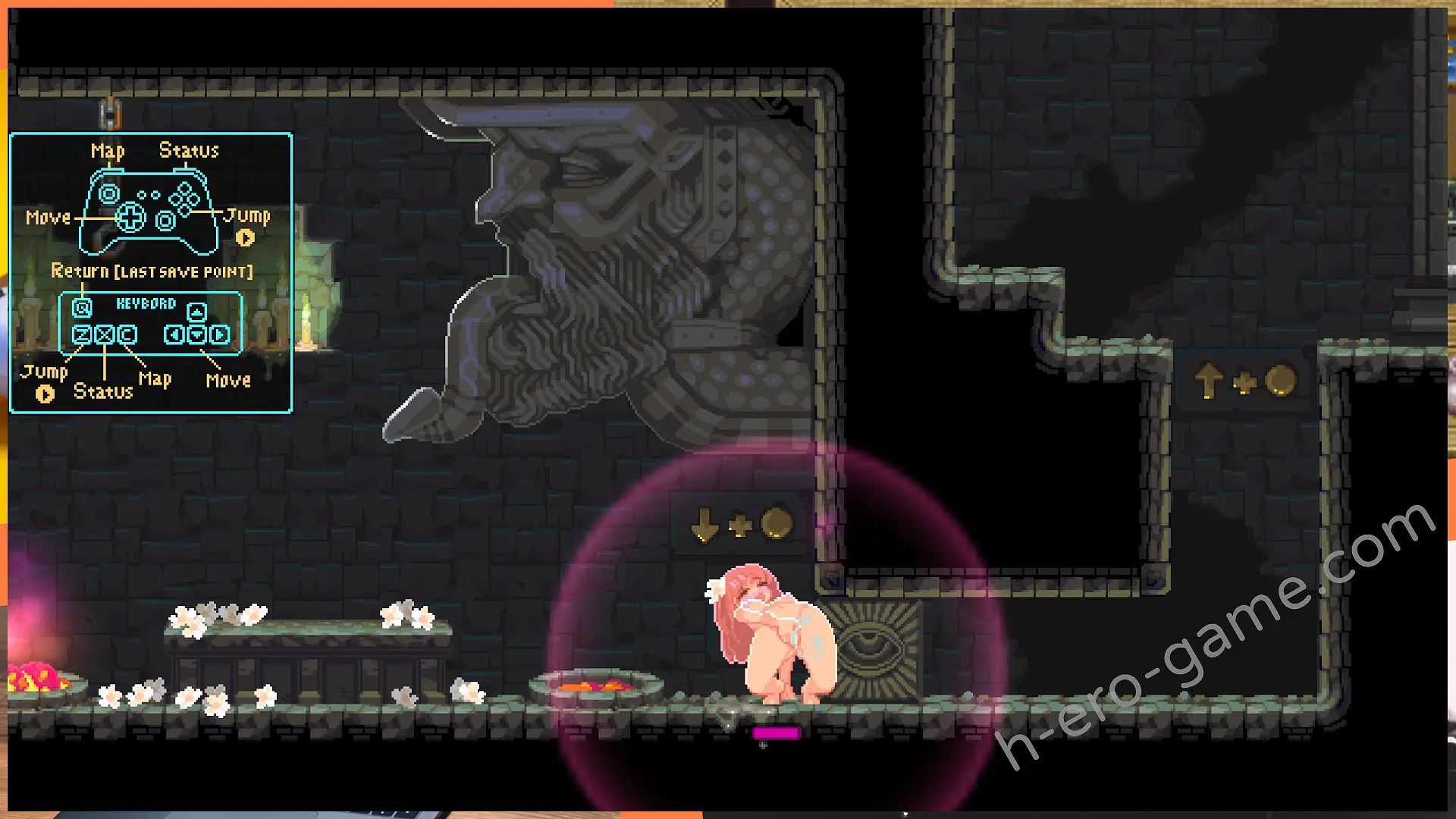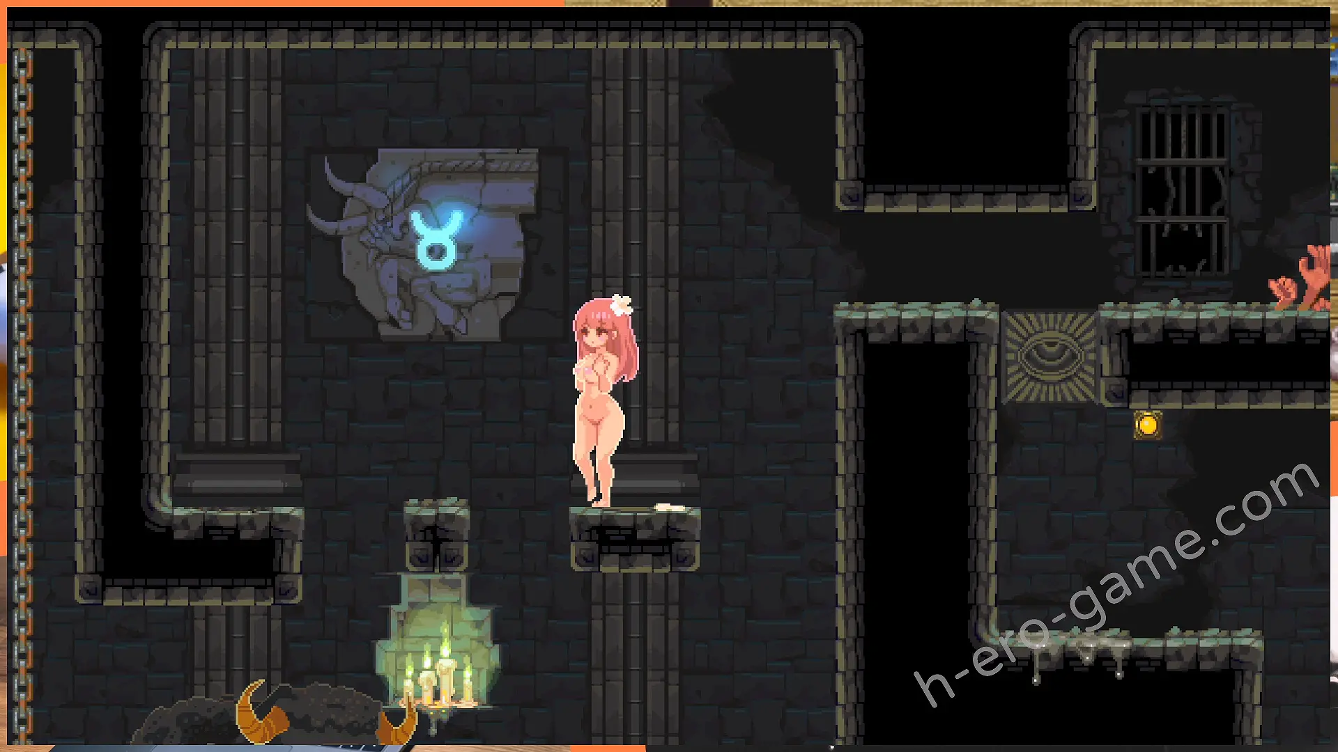 例如在最開始祭壇右邊能看到有著眼睛圖案的磚塊,這時蹲下自慰到絕頂就能消除掉磚塊開出通路。