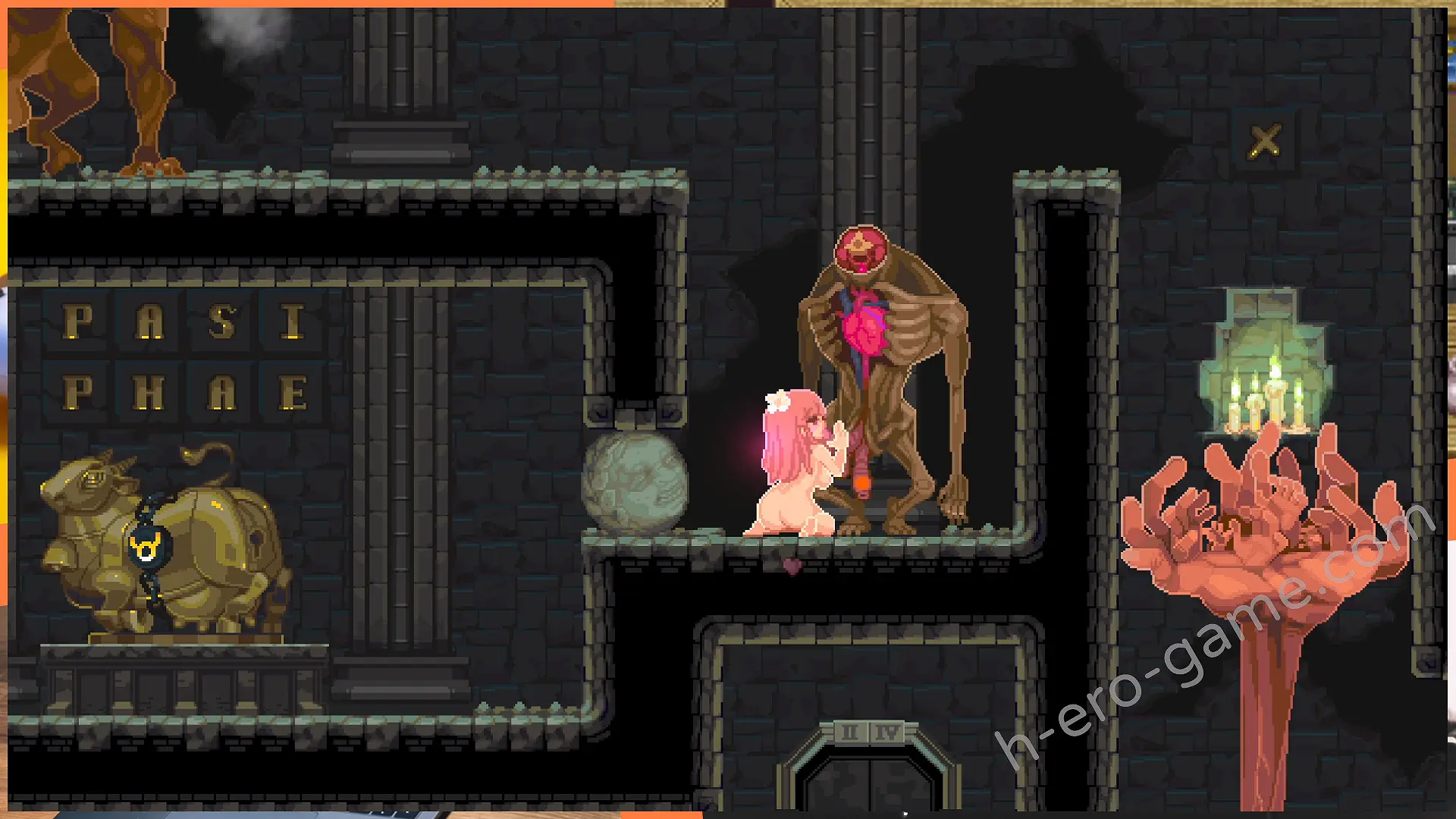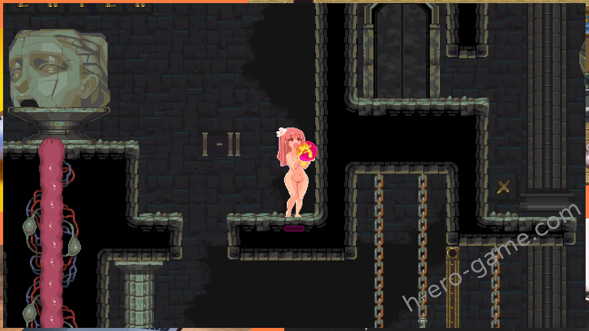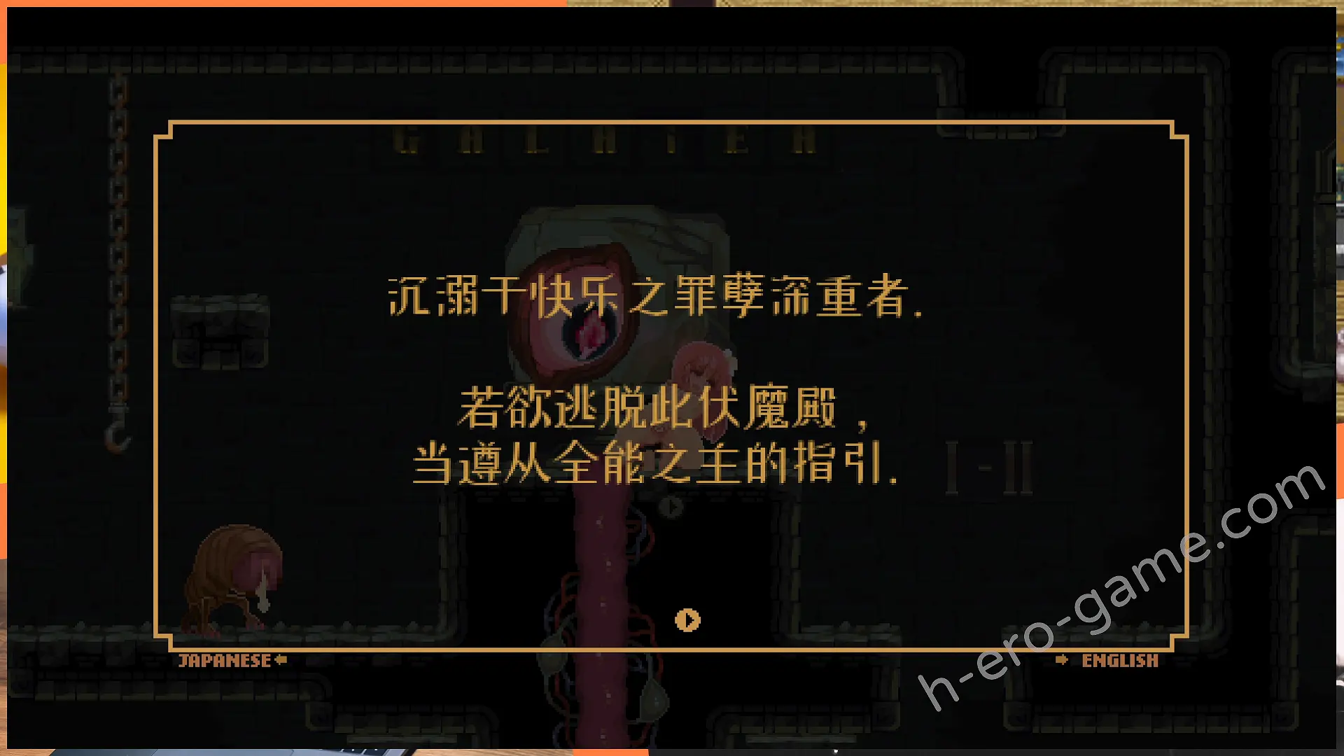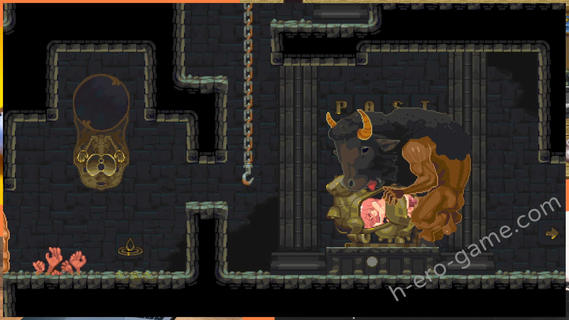 例如在最開始祭壇右邊能看到有著眼睛圖案的磚塊,這時蹲下自慰到絕頂就能消除掉磚塊開出通路。