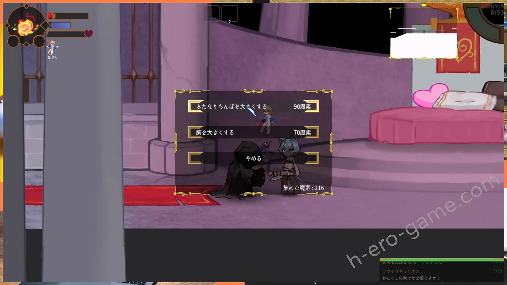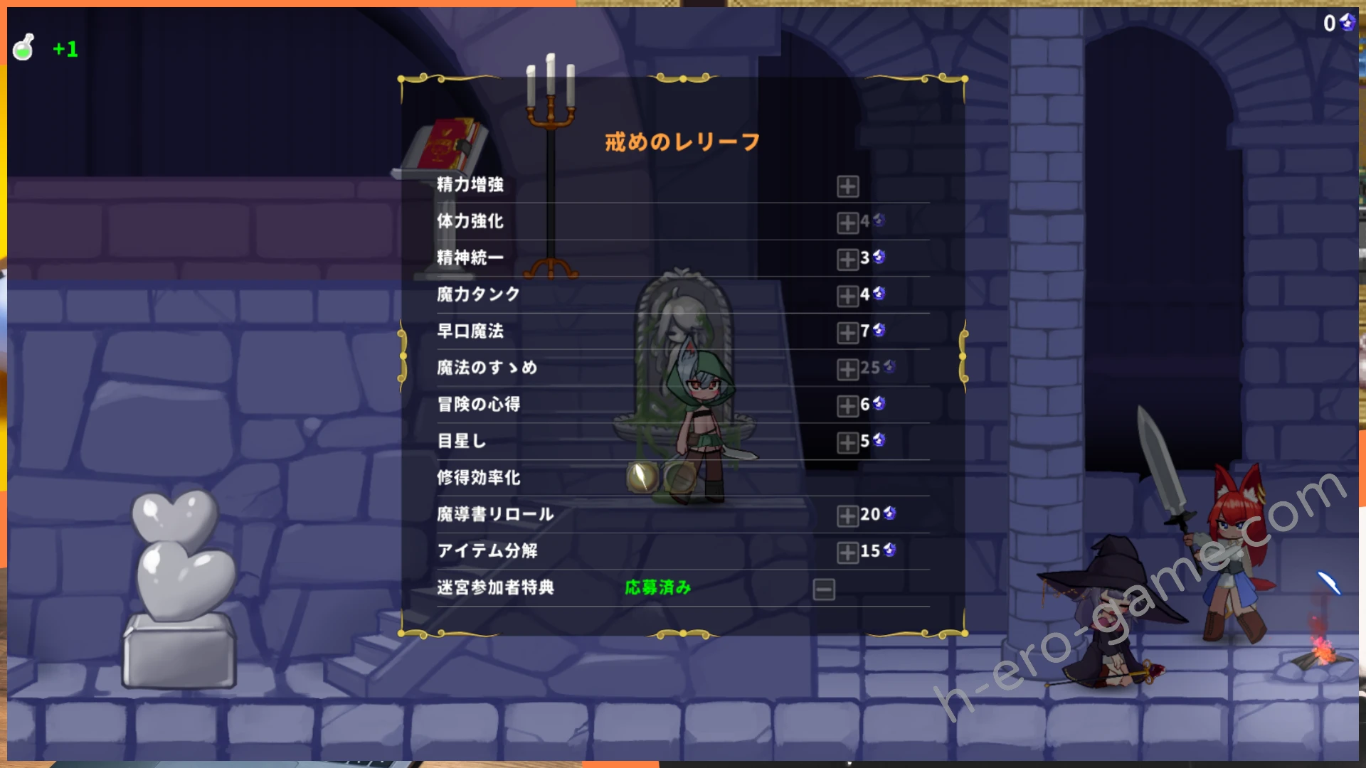 在據點中可以使用魔晶升級丁丁跟胸部,丁丁是強化魔法攻擊力,胸部則是增加MP。由此可以發現角色的普通攻擊無法增強,所以要輕鬆的攻略地城就必須要逐漸將魔法攻擊加進輸出方式之中。