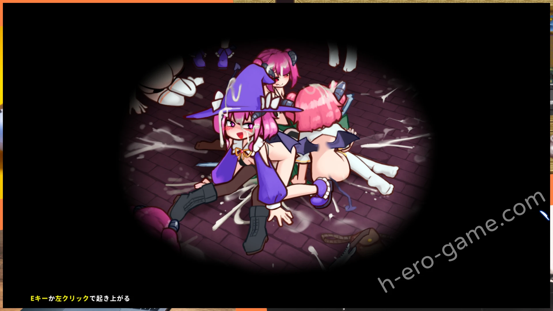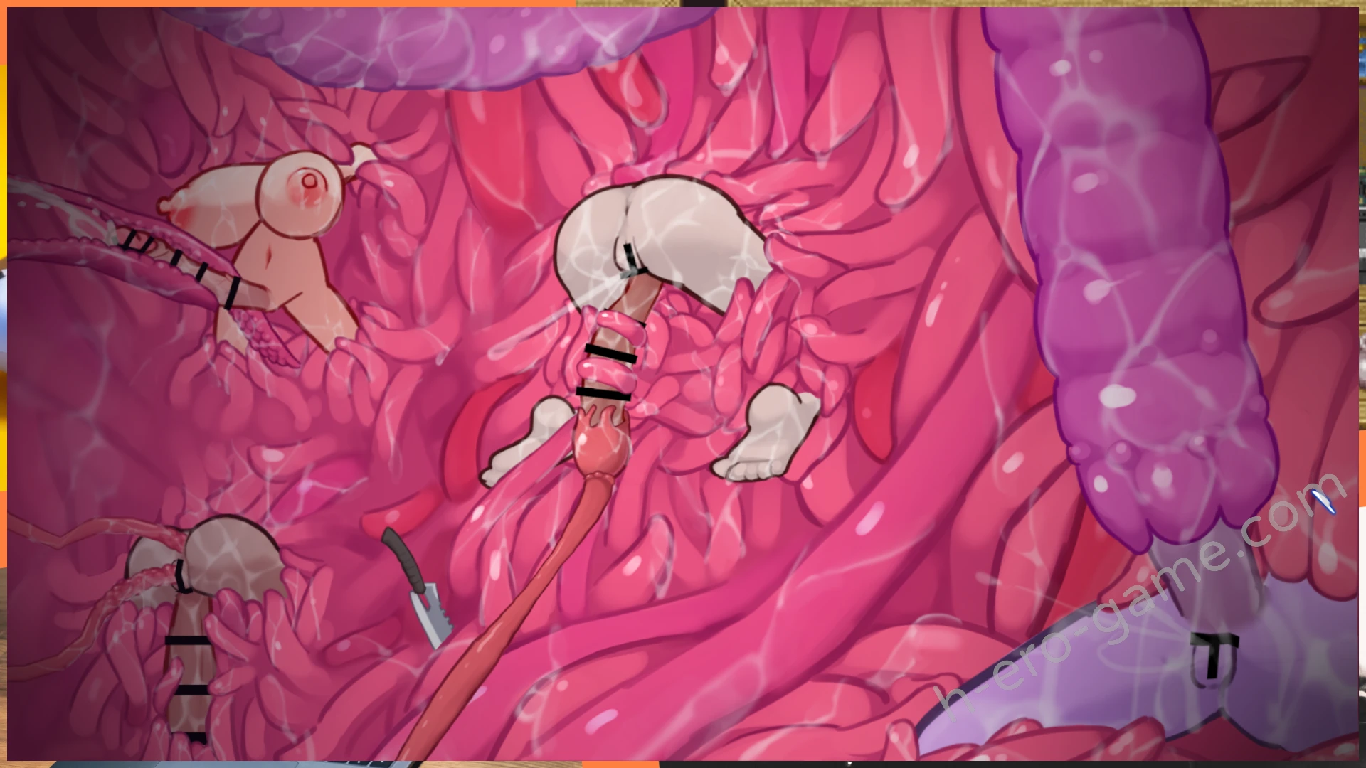 工口部分的演出是三種2D動畫,第一個是在地城中被魔物娘逆推,這是在畫面中央的小框顯示。再者是像脫離地城失敗被榨乾的場景,這部分是全畫面CG。