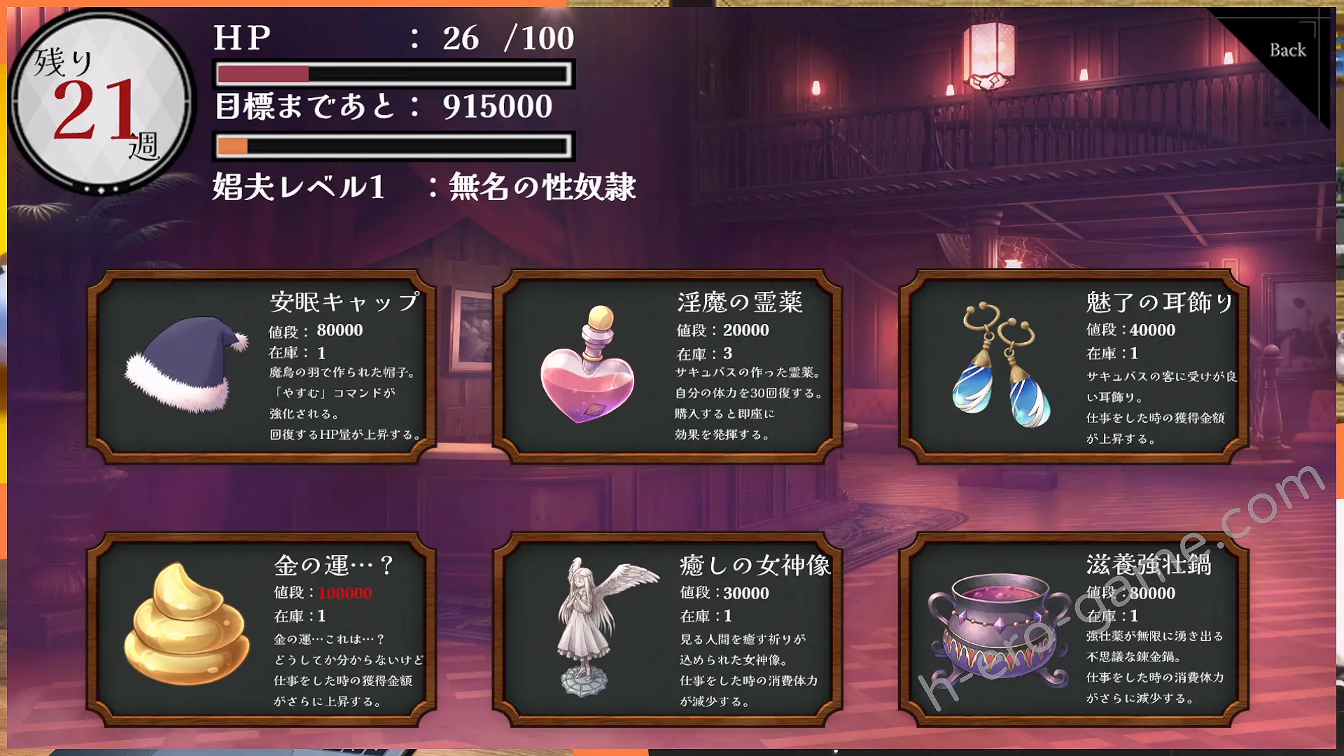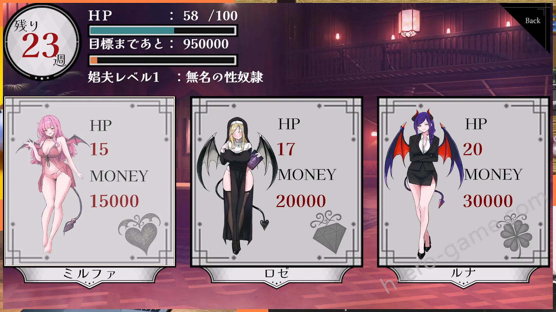 雖說是很多人有興趣的娼館題材模擬遊戲,不過卻是被嫖的那邊。舞台設定在魔界的娼館之中,目標是要在二十五周內存夠一百萬為自己贖身。