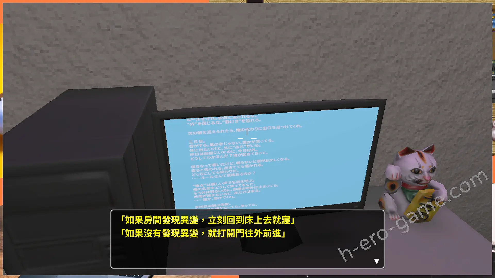 每一晚都需要觀察空間內是否出現異常,並依據判斷結果選擇就寢或出門,正確與否將直接影響進度。