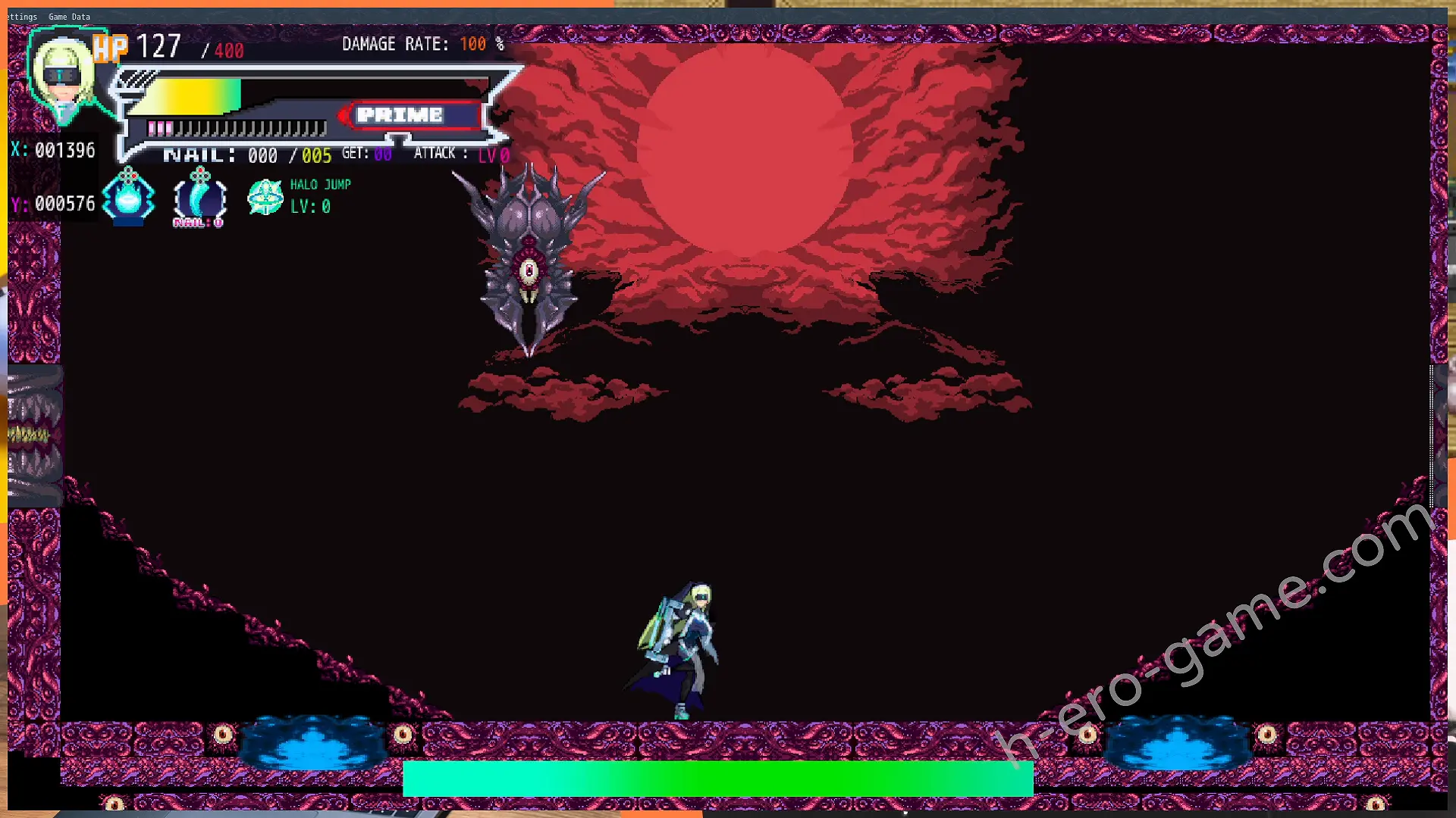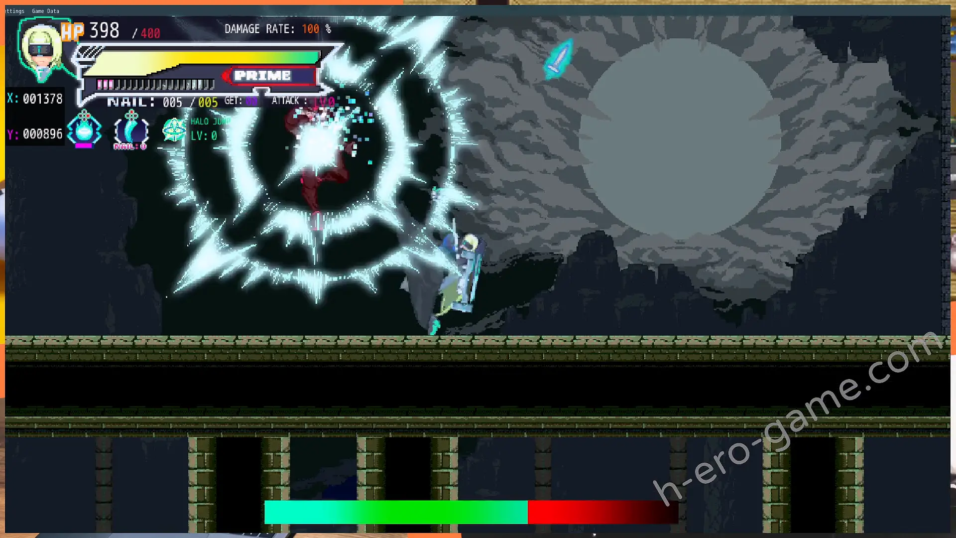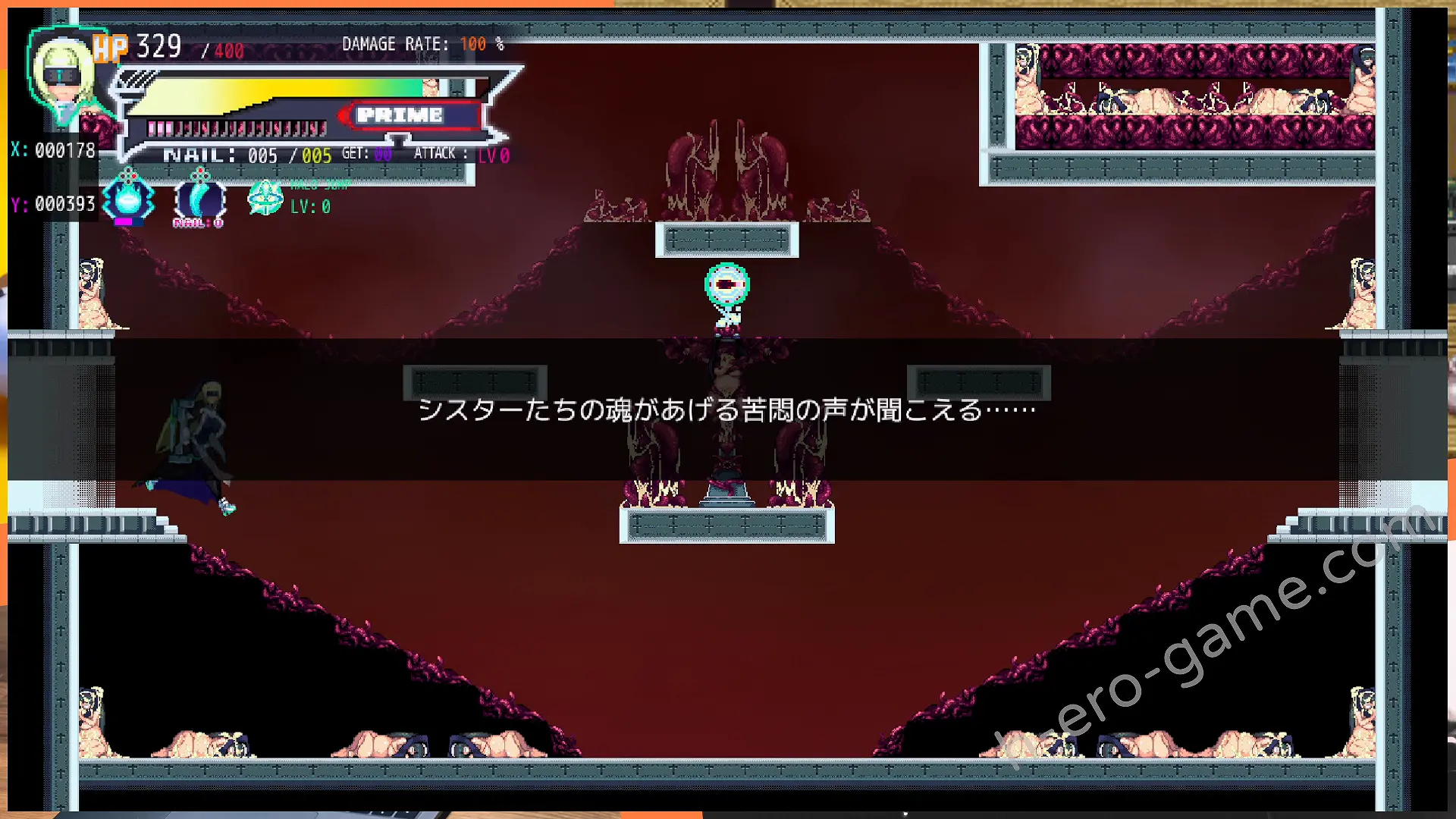再來是較複雜的部分,遊戲中的切換鍵按下後時間變慢並且畫面變成灰白,但一開始完全不知道是做什麼的。這是在解放修女靈魂獲得技能之後,可以用切換鍵加射擊鍵更改射擊模式,也可以加魔法鍵或加技能鍵來切換技能。像是射擊模式顯示為「PRIME」就是初始的射擊,切換成「ECHOES」後變成中距離的榴彈。最後還有按著特殊鍵加射擊鍵發動需要消耗NAIL的特殊射擊,因為特殊鍵不太常使用,所以經常被遺忘。