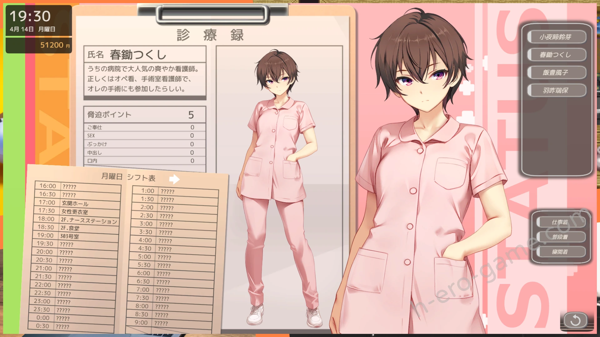 雖然概念上很好懂,但一開始玩還是會有點不知所措,不知道要去哪裡做什麼。總之就先蒐集女角們的行程,她們每天每時的行動雖說不是一成不便,但其實有一些規律。像是會在該來上班的時間到達醫院門口,然後到女子更衣室,到護士站交接工作,在食堂吃飯之後就開始巡病房,由於是夜班工作所以也會去返眠室休息等等……