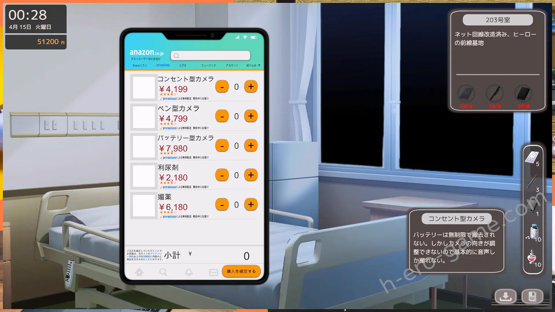 金錢主要是購買各種攝影機,還有媚藥跟利尿劑。手上有多餘的攝影機,能夠更方便的收集影片。而藥劑可以添加在食堂的伙食當中,能夠改變女角們的狀態,讓她們會去上廁所,或是在返眠室中自慰。